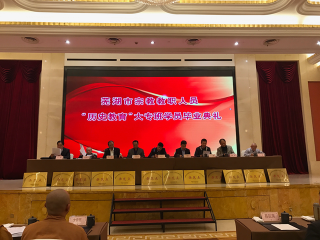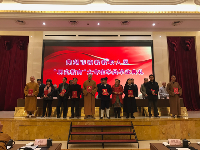 公司党委副书记李琳琦为毕业学员代表颁发证书,经理徐彬宣布了关于表彰2015级“历史教育”大专班优秀学员的决定。芜湖市宗教教职人员在两年半的学习时间里,坚持以核心价值观为指导,努力学习科学文化知识,他们不仅顺利毕业,还涌现出了一批思想进步、学习成绩优良的学员。