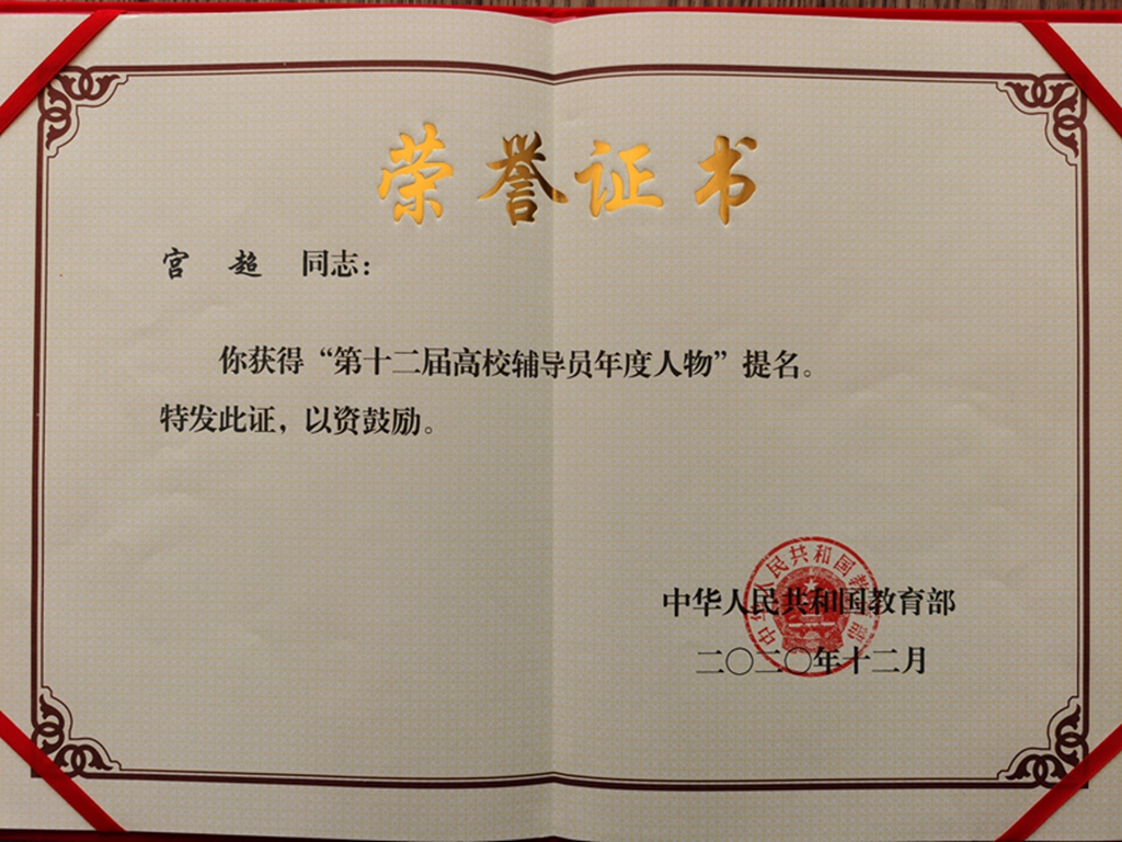 “第十二届高校辅导员年度人物”推选展示活动于2020年6月启动,是教育部为深入学习贯彻习近平新时代中国特色社会主义思想,全面贯彻落实《教育部等八部门关于加快构建高校思想政治工作体系的意见》等文件精神,着力打造高素质思想政治工作队伍,大力培养选树新时代高校辅导员先进榜样而开展的一次全国高校辅导员参与的推选展示活动。宫超老师通过公司、安徽省教育厅逐级审核推荐,与来自全国的近300余名辅导员一起角逐。经过匿名通讯评审等环节,共计79人进入终评答辩。终评答辩分为自我陈述和网络直播答辩两个环节,宫超老师思路清晰、情感真挚、逻辑性强,充分展现出公司辅导员队伍爱岗敬业的精神和较高的综合素养,最终获评“第十二届全国高校辅导员年度人物”提名。