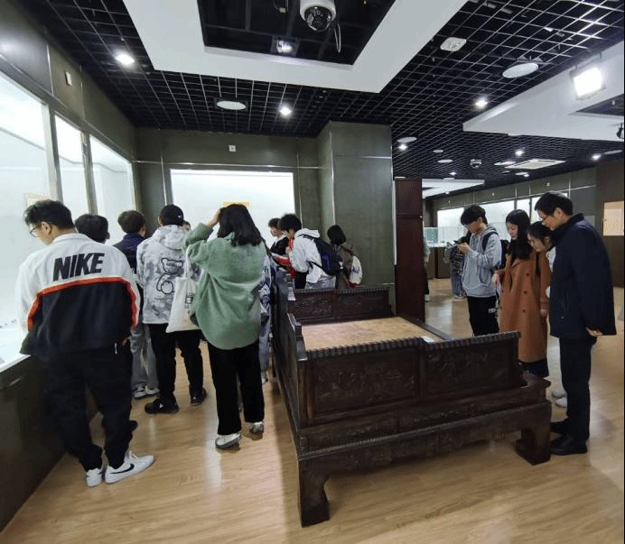 对于这次研习,同学们表现非常积极,大家成群结队跟随两位讲解员的脚步,仔细聆听每一件精美藏品背后的故事。黄花梨雕龙毗卢帽五扇座屏,屏风通体为黄花梨木制,分五扇,屏框饰夔龙拐子纹,屏心正面浮雕五爪正龙及云龙,用料考究,雕工精细。紫檀雕花鸟松竹大屏风,正面雕刻松、竹、花、鸟、鱼等图案,背面屏心阳刻朱熹四言诗文,制作精致,栩栩如生。