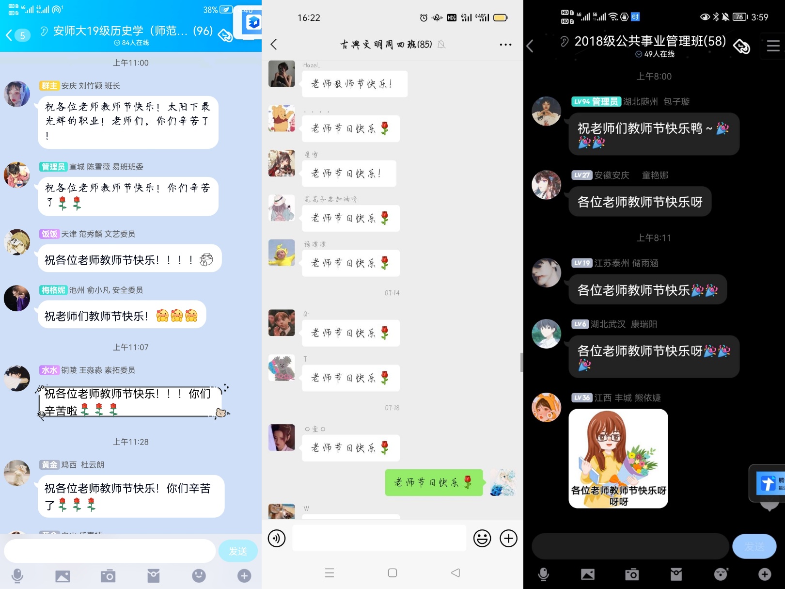 电子化信息时代,表达祝福更加便捷。教师节当天,公司各年级各专业的同学们纷纷通过电子邮件、微信、QQ群、短信等线上形式,让内心的敬意承载着电流化作一个个字符、一张张图片为老师们送上朴素真挚的祝福。