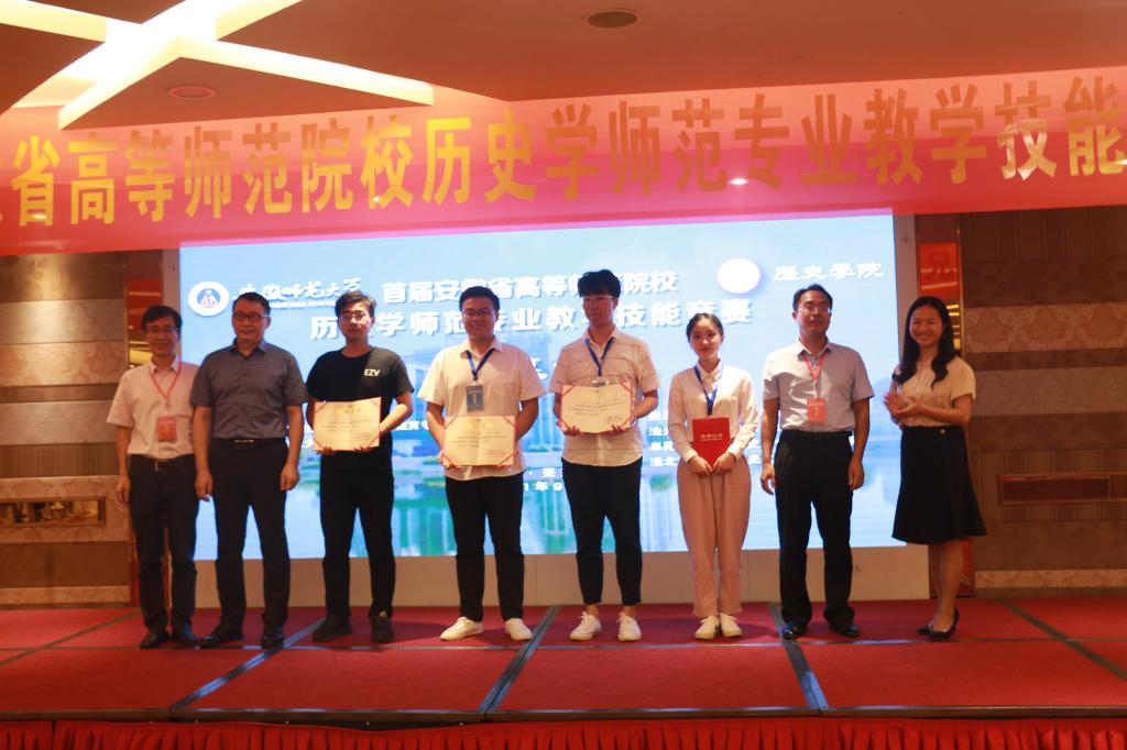 本次大赛秉持“公平、公正、公开”原则,选手分为本科生和研究生两大组,每大组再细分为AB两小组,参赛选手在前一天晚上8点半以逐个抽签的方式分别确定第二天授课的组别、出场顺序和竞赛内容,会务组同学现场拍照记录每个选手的参赛信息。为公平公开起见,正式竞赛时参赛选手按序号核对身份后进入教室参赛,评委只知参赛选手序号,不知参赛选手的公司和姓名。本次教学技能竞赛分为讲课与说课两部分,竞赛内容限定为统编版《中外历史纲要》上册1-29课。参赛选手根据抽签先进行说课,然后自选该课部分内容讲课。为公正期间,选手不得将手机带入等待室、竞赛室,待赛选手在三楼相应等待室等候,由工作人员提醒后方可进入五楼比赛场地。竞赛组委会聘请了高校教育专家、中学一线名师担任评委,每个小组由3名专家组成,严格按照评分标准评分,计算平均分作为最终成绩。本次竞赛活动研究生和本科生均分设一等奖、二等奖、三等奖若干,并另设优秀指导教师奖。经过一天紧张的比赛,来自淮北师范大学的董晨、安庆师范大学的缪志强、英国正版365官方网站的缪家慧、阜阳师范大学的耿秋怡四名选手荣获研究生组竞赛一等奖,来自阜阳师范大学的韩小花、阜阳师范大学的尹政、淮北师范大学的高强、英国正版365官方网站的张怡然四名选手荣获本科生组竞赛一等奖。来自其他高校的十余名师生荣获了此次竞赛的二等奖、三等奖、优秀指导教师奖。