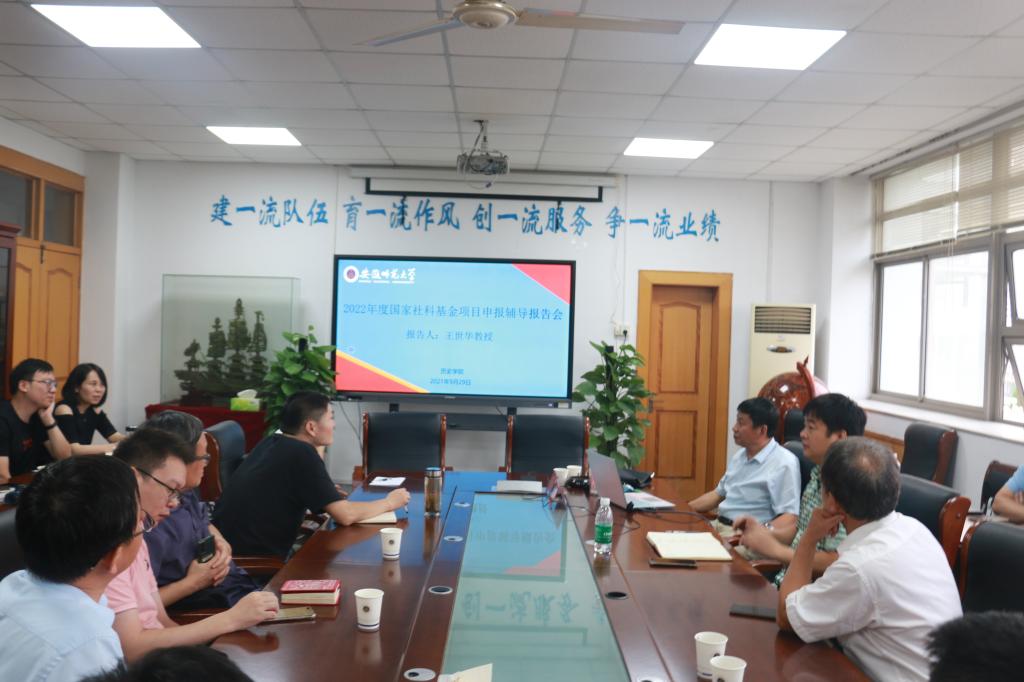 王世华教授结合自身多次申报国家社科基金的经验和体会,就项目申报书填写作了详细讲解,结合公司中国历史2021年度国家社科基金项目申报书逐份进行了点评,并对项目的选题、学术史回顾、论证、创新点、资料、最终成果的撰写规范及技巧作了重点阐述。王老师强调,项目申报重在选题要新、论证要充分,鼓励进行跨学科申报。他动员教师积极申报课题并给出了几点建议:一要败而不馁,贵在坚持,确保申报数量;二要凝练科研方向,练好内功;三要重视后期资助项目的申报。