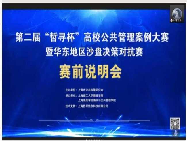 本网讯(图/文 郑子悦)9月25日至26日,由上海市公共政策研究会主办,上海理工大学管理公司、上海海关公司海关与公共管理公司联合承办,上海哲寻信息科技有限公司提供全面技术支持的第二届“哲寻杯”高校公共管理案例大赛暨华东地区沙盘决策对抗赛通过线上形式举行。