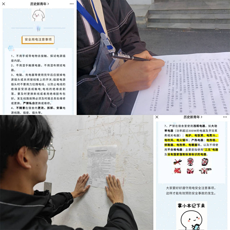 生命可贵,安全防范警钟长鸣。通过“历史新青年”公众号推文发布、班级通知及官方qq通知,提醒员工冬季消防安全的必要性。线上宣传以趣味多样的形式,丰富的细节展示,充分提醒每一位同学注重冬季用电安全。同时发布了冬季宿舍安全告知书,并贴在寝室楼下。告知书着重强调了校园火灾的隐患、防范火灾的措施及火灾逃生自救常识,以此提高员工安全防范意识。