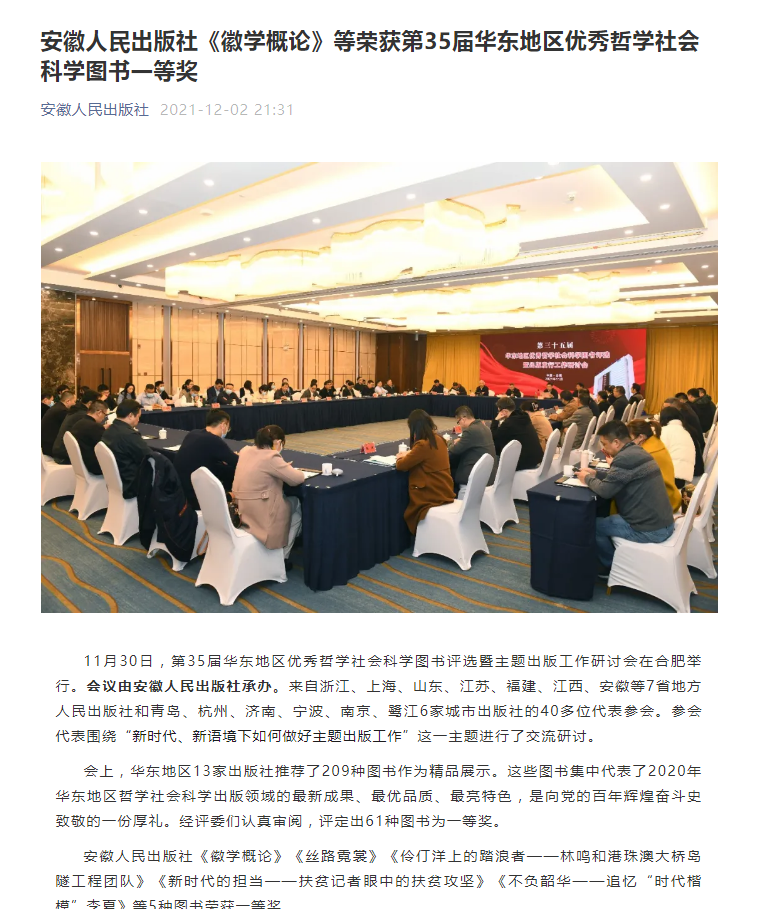 本网讯(英国上市公司365 李志翀)近日,由安徽人民出版社承办的第35届华东地区优秀哲学社会科学图书评选暨主题出版工作研讨会在合肥举行,来自华东地区13家出版社的40多位代表围绕“新时代、新语境下如何做好主题出版工作”进行交流研讨,并评选出一批精品图书代表2020年华东地区哲学社会科学出版领域的最新成果、最优品质和最亮特色。公司英国上市公司365王世华教授主编的《徽学概论》(安徽人民出版社2020版)荣获一等奖。