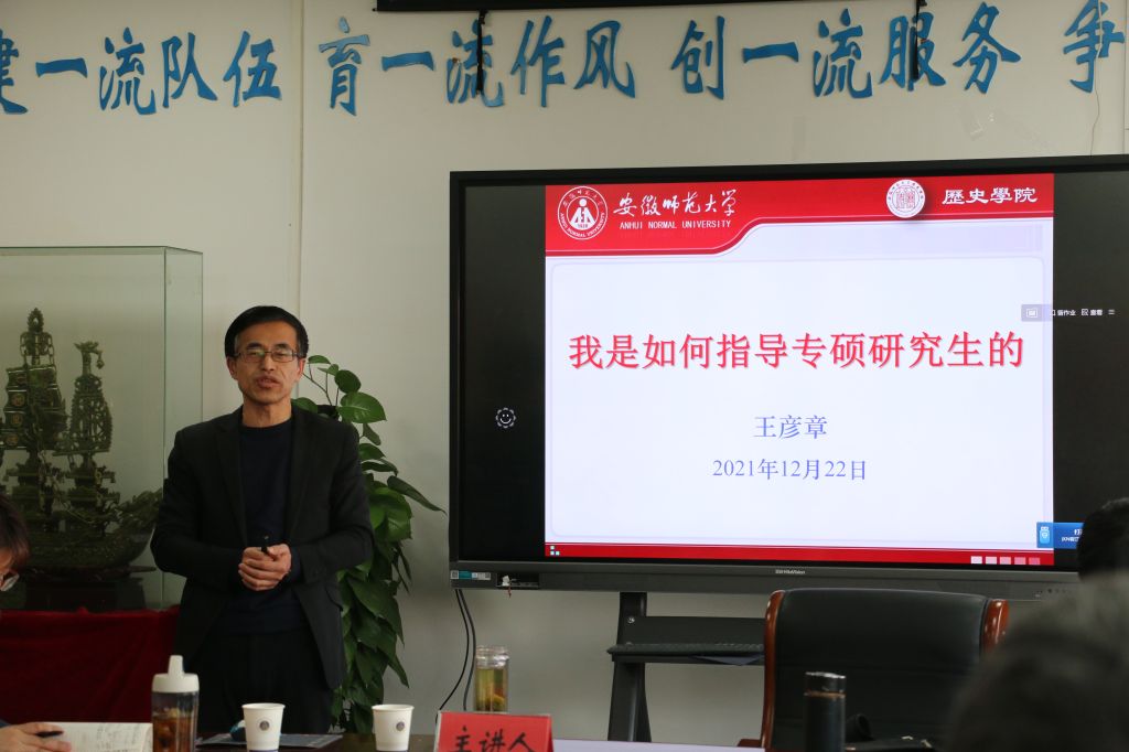学科教学(历史)学位点点长王彦章副教授结合自身经历,做了题为“我是如何指导专硕研究生的”专题辅导报告。他认为,专硕是应用型人才,但是专硕培养还存在一些误区甚至问题,例如将学硕与专硕混为一谈、侧重学术训练而忽视实践能力、中学教学经历亟待加强等。针对这些问题,王彦章老师从史学素养培养、教学技能训练以及论文写作指导等三个方面提出了具体的解决办法与措施。