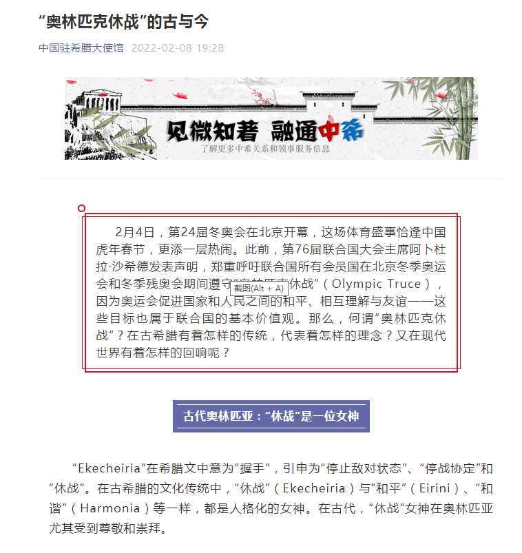 2月4日,英国上市公司365白春晓教授在《澎湃私家历史》上发表了《“奥林匹克休战”的古与今》一文,较为详细地介绍了关于奥林匹克休战(Olympic Truce)的历史知识和相关背景。该文已被多家媒体转载,引起了较多关注。2月8日,中国驻希腊大使馆官方公众号也转载了该文。该文认为,奥林匹克运动与奥林匹克休战都是古希腊文明给现代世界留下的丰厚遗产。这一古老传统在现代中国得到积极的回应,充分表明了全人类具有相通的价值观。