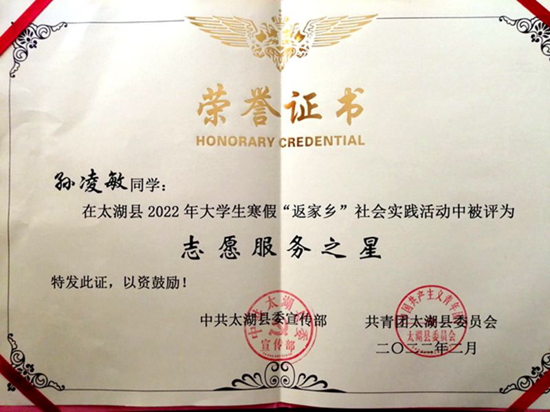 在助力疫情防控志愿活动中,孙凌敏累计提供了120余小时的志愿服务,被中共太湖县委宣传部、共青团太湖县委员会授予“志愿服务之星”荣誉称号,在表彰大会上进行表彰,并被太湖新闻媒体报道。