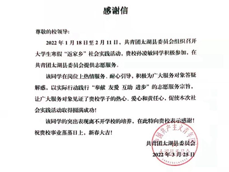 2022年寒假,随着外来返乡人士增多,疫情防控工作压力增大,在团太湖县委的带领下,孙凌敏组织了140余名返乡老员工进行疫情防控志愿活动,从起草志愿服务承诺书,到联系用人单位开展志愿者培训;从城区建立七支志愿服务队,到各乡镇的志愿活动遍地开花;从统计140余名志愿者的服务时长,到为“服务之星”召开表彰大会,在整个流程中,她都亲身经历并有了深切体会。此外,她还负责制作微信推文、拍摄活动照片、拟写总结材料、撰写新闻稿与发言稿等宣传工作,弘扬志愿精神,传播先进故事。其中,关于志愿服务启动仪式暨培训会的报道得到了安徽省共青团的转发。