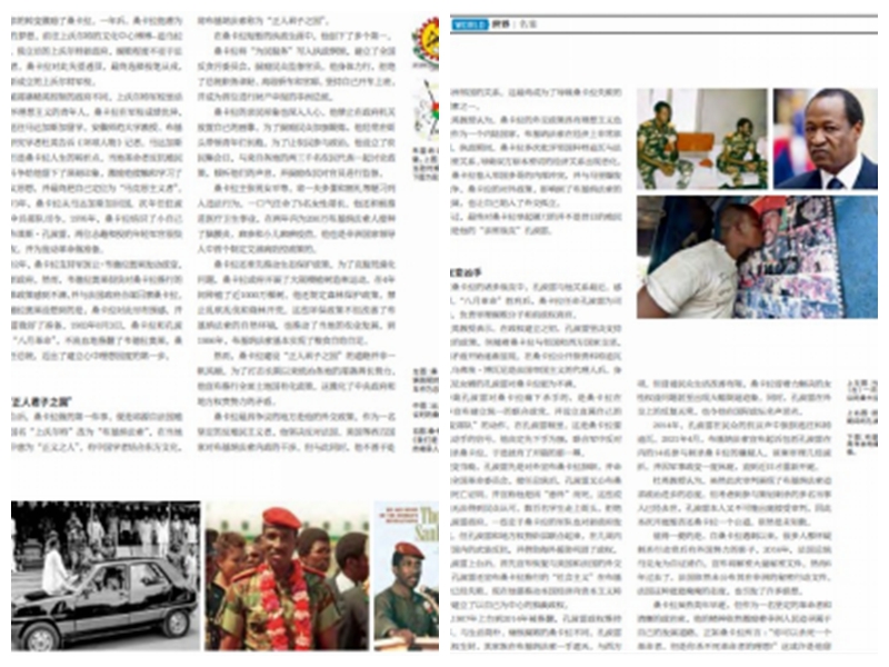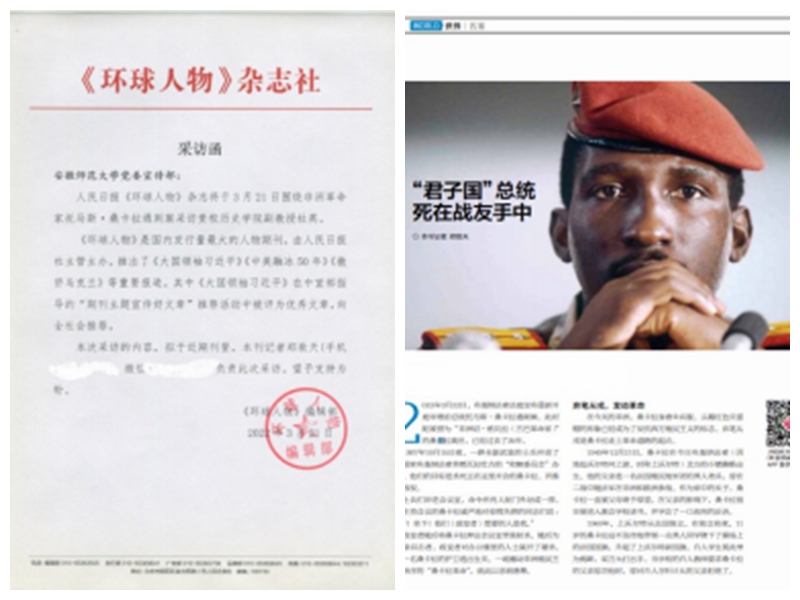 托马斯·桑卡拉是非洲小国布基纳法索前总统,有“非洲切·格瓦拉”之称。1987年10月15日,托马斯·桑卡拉在其亲密战友布莱斯·孔波雷发动的政变中被枪杀,随后孔波雷当选总统,执政27年,后在2014年的政变中被推翻,流亡科特迪瓦。2022年3月22日,布基纳法索政府重审桑卡拉遇刺案,引发国际社会对这位“君子之国”总统的高度关注。采访杜英副教授的报道文章《“君子国”总统死在战友手中》刊登在《环球人物》杂志2022年第7期第58-60页。