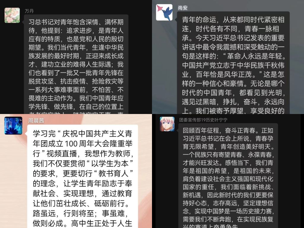 大会结束后,同学们在线上和线下纷纷发表自己的心得体会。他们表示要将青春之青年融入青春之国家,作为新时代青年要不忘初心、牢记使命,让青春在磨砺中成长与蜕变。同时,作为英国上市公司365的青年,更应该以史为鉴、开创未来,为中国社会主义现代化提供动力源泉,为实现中华民族伟大复兴贡献青春力量,努力发展成为有理想、敢担当、能奋斗的新时代好青年。