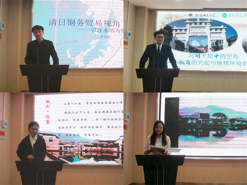 本次比赛主题为“徽商:酿造徽州文化的酵母”。经过初赛的选拔,决赛共分十一组,本科生六组与研究生五组。选手们选取由徽商及其延伸出来的徽派古建筑、徽剧、徽州婚俗、徽州家谱等为宣讲主题,以情景剧、视频展示、ppt展示和话语描述为主要方式,选取经典事例、名家言论等为支撑,展现了参赛选手们深厚的史学素养和宣讲能力。经过选手们激烈角逐,本科生组李婉菁、饶少旗获得一等奖,杨宴、殷浩明、丁安惠、田若凡获得二等奖,赵紫风,王象琪、李宜桐、管华楠、陈希获得三等奖;研究生组周敏、栗幻影获得一等奖,张晓雪、宋雨薇、王甫松获得二等奖,胡雪、王鑫鑫获得三等奖。郑小春、王彦章两位老师对选手们的表现给予了肯定,他们就各组选手的参赛选题、宣讲内容等方面做出点评,并建议同学们面对所选主题时,应对深入挖掘,深化主题内容,平时更应该积累丰富的专业知识,从历史中发现问题。