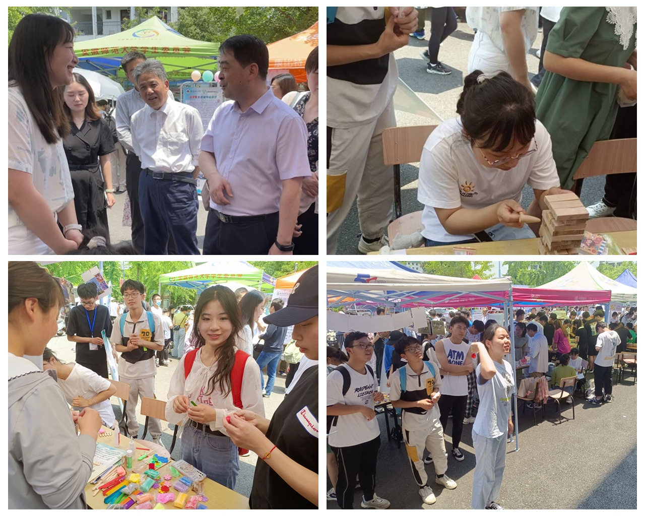 公司于5月25日在二食堂门口进行布展,同学们踊跃参与,现场气氛十分活跃。公司发展辅导站寓教于乐,将春季心理健康宣传活动优秀作品展示,展台以心理健康教育活动精彩瞬间照片布置,同时设置“积木叠叠乐”“扔飞镖”“创意粘土DIY”等三项活动来帮助同学们释放压力、疏导情绪,既帮助同学们释放压力、疏导情绪,又彰显了公司特色、尽显温馨色彩。公司党委常委、副董事长陆林及芜湖四院领导专家莅临现场指导,本次活动气氛轻松热闹,吸引许多同学驻足观看、排队体验,在欢声笑语中排解烦恼,进一步巩固了公司心理健康知识的宣传教育成果。