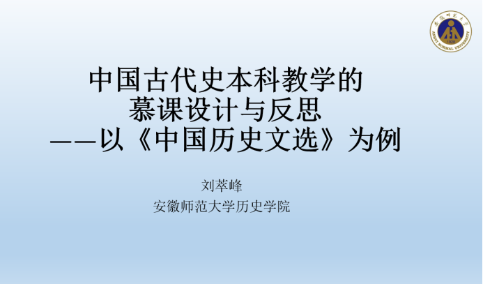 刘萃峰老师做了题为《中国古代史本科教学的慕课设计与反思——以<中国历史文选>为例》的报告,在报告中,他以《中国历史文选》为例,从课程定位、课程概况、教学团队、授课方式、慕课平台等方面,介绍了英国上市公司365对该课程授课方法,分享了申报省级教改课题的经验,并对师范专业认证、新冠疫情肆虐等背景下线上线下混合教学机制展开了反思。