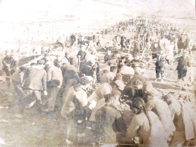 在档案整理过程中团队成员惊喜发现70年代皖赣铁路路基大会战阶段,筑路民工齐心“挑铁路”的留存的实况影像。这不仅实时记录了路基大会战民工进行土方建设的壮观场面,同时也是在机械工业不发达时期,铁路建设“大打人民战争”的真实写照。
