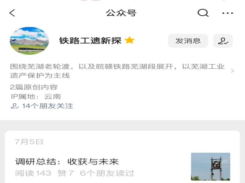 为扩大本次活动的宣传影响,尽可能的引发大众对铁路工业遗产的兴趣,以推进芜湖铁路工遗保护的工作进程,团队创建“铁路工遗新探”公众号,根据每日调研情况与实践感悟发布《铁路桥梁:化天堑为坦途》《火车站点:皖赣铁路的“守望者”》等十余篇高质量推文,得到大众积极反馈。