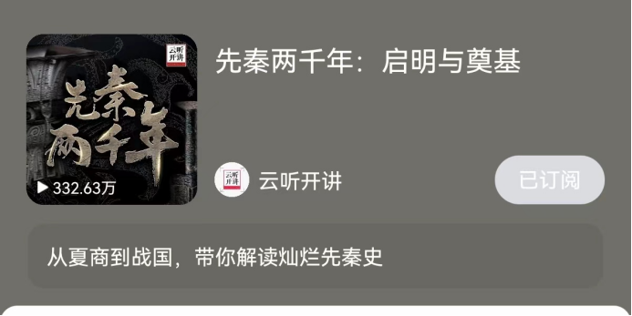 《先秦两千年》自2022年3月正式上线以来,截止8月下旬,已经获得332.63万点击率,单集平均点击率超15万。在云听历史“听听正史”类课程中,除了中国社会科公司历史所制作的百集《中国通史》外,《先秦两千年》的总点击率已经进入前三。