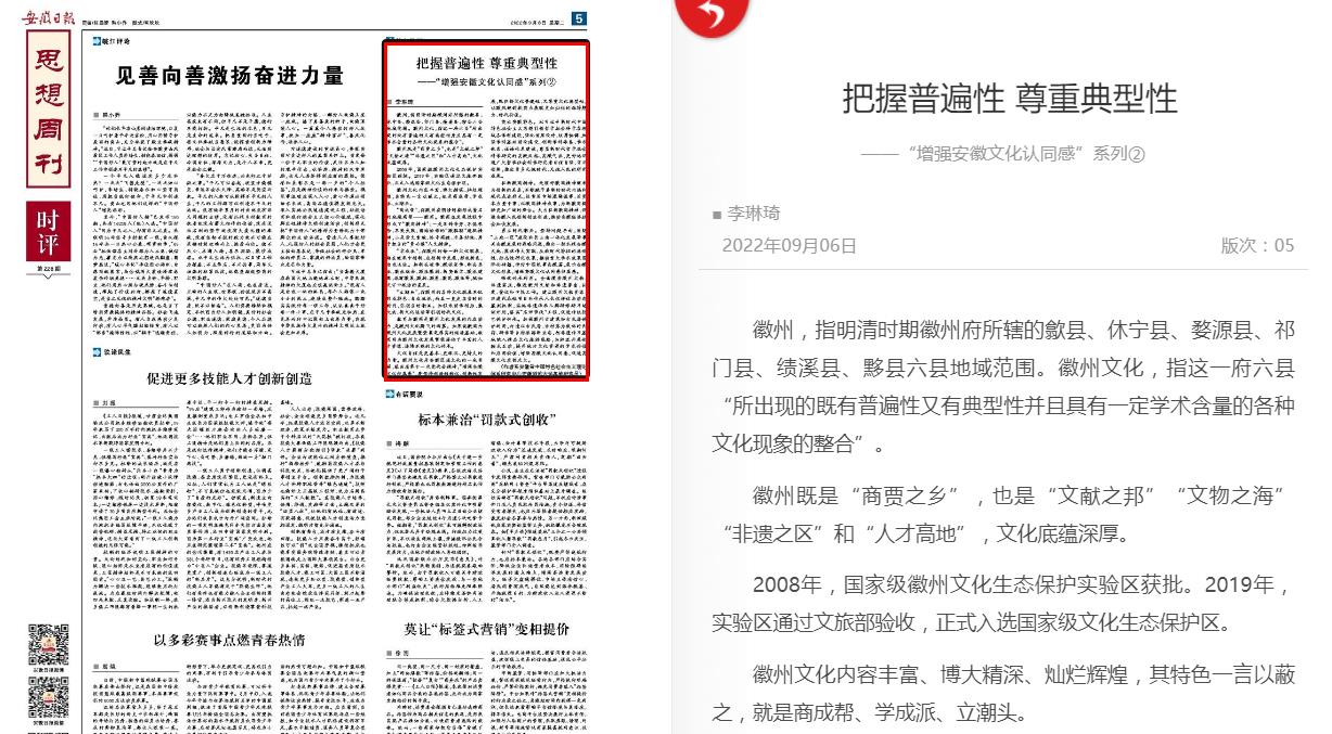 本网讯(英国上市公司365)9月6日,《安徽日报》第5版刊发了公司李琳琦教授《把握普遍性 尊重典型性》文章,该文是“增强安徽文化认同感”系列论文之一。文章指出,徽州文化内容丰富、博大精深、灿烂辉煌,是安徽区域文化的一朵奇葩。落实省第十一次党代会精神,“增强安徽文化归属感”,要坚持创造性转化、创新性发展,既弘扬文化普遍性,又尊重文化典型性,让徽风皖韵软实力展现更加灿烂的独特魅力、时代价值。