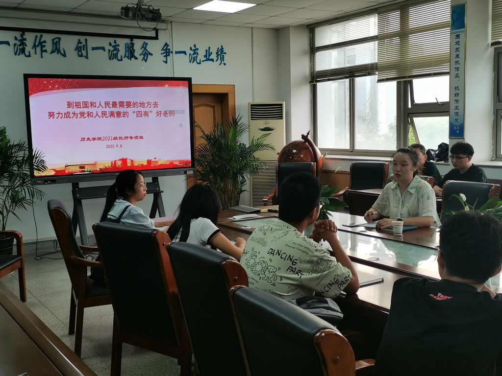 座谈会末,辅导员韩雪领学了习近平总书记给北京师范大学“优师计划”师范生的回信,希望同学们刻苦学习,砥砺品格,增长传道授业解惑本领,努力成为党和人民满意的“四有”好老师。