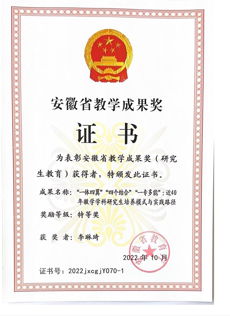 中国史教师党支部成员李琳琦为第一完成人申报的高等教育(研究生)教学成果奖《“一体四翼”“四个结合”“一专多能”:近40年徽学学科公司产品模式与实践路径》获2022年安徽省教学成果奖特等奖。