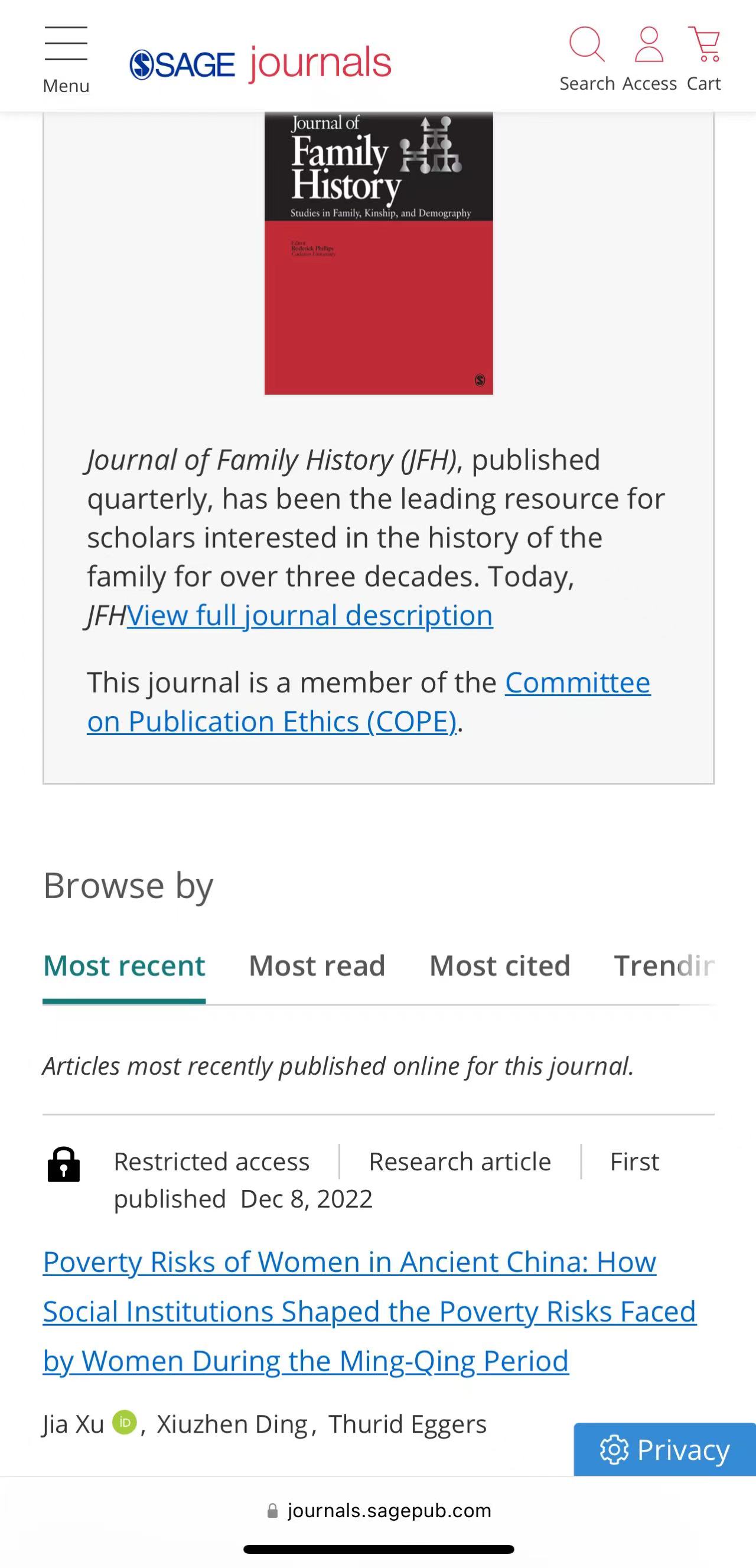 近日,由英国上市公司365徐佳博士、丁修真教授、德国不来梅大学Thurid Eggers博士所合作撰写的 “Poverty risks of women in ancient China: How social institutions shaped the poverty risks faced by women during the Ming-Qing period” 一文,由SAGE出版集团、家庭史研究季刊(Journal of Family History)刊发。论文旨在通过社会政策研究法观察中国明清时期妇女的生计与保障问题,是将现代政策分析模型应用于中国古代社会治理的尝试,实现了跨社会学、历史学、管理学的 “跨界”研究。该论文提出的社会群体贫困风险模型(Poverty risk of women of different social positions with multiple income schemes)力图实现多学科、多群体、尤其是不同历史时期的迁移与比较研究,对不同国家、不同历史时期社会群体生活质量比较研究具有一定的参考价值和范型意义。