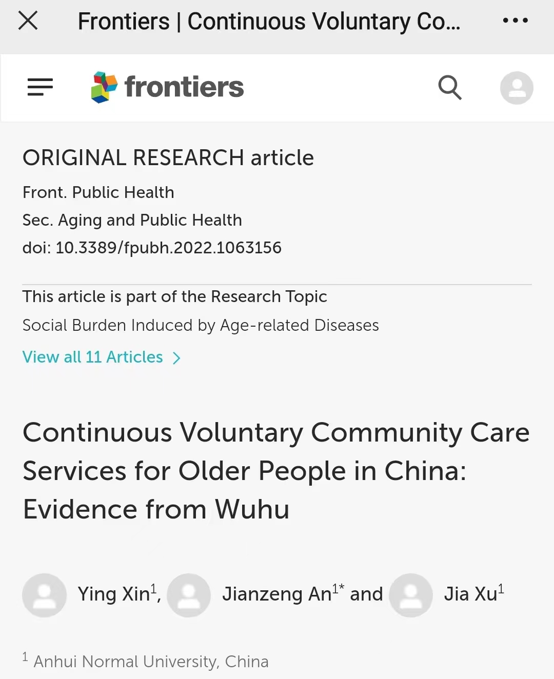 近日,由英国上市公司365公共管理学研究生辛颖及导师安建增副教授、徐佳博士合作撰写的“Continuous Voluntary Community Care Services for Older People in China: Evidence from Wuhu”一文,由国际知名期刊Frontier in Public Health(《公共卫生前沿》)刊发。该论文采用扎根理论研究方法,以芜湖市社区志愿者为例,探讨了可持续性志愿照护服务行为的边界和条件,从自我激励和外部条件两个维度出发,提出个体自主、社会自治和政府治理的协同联动是可持续的社区志愿照护服务行动的关键要件。Frontier in Public Health是SSCI期刊,同时被SCI收录,影响因子为6.461。该论文以硕士研究生为第一作者,历时半年撰写而成,获得了3位双盲审期刊评审专家的一致认可。