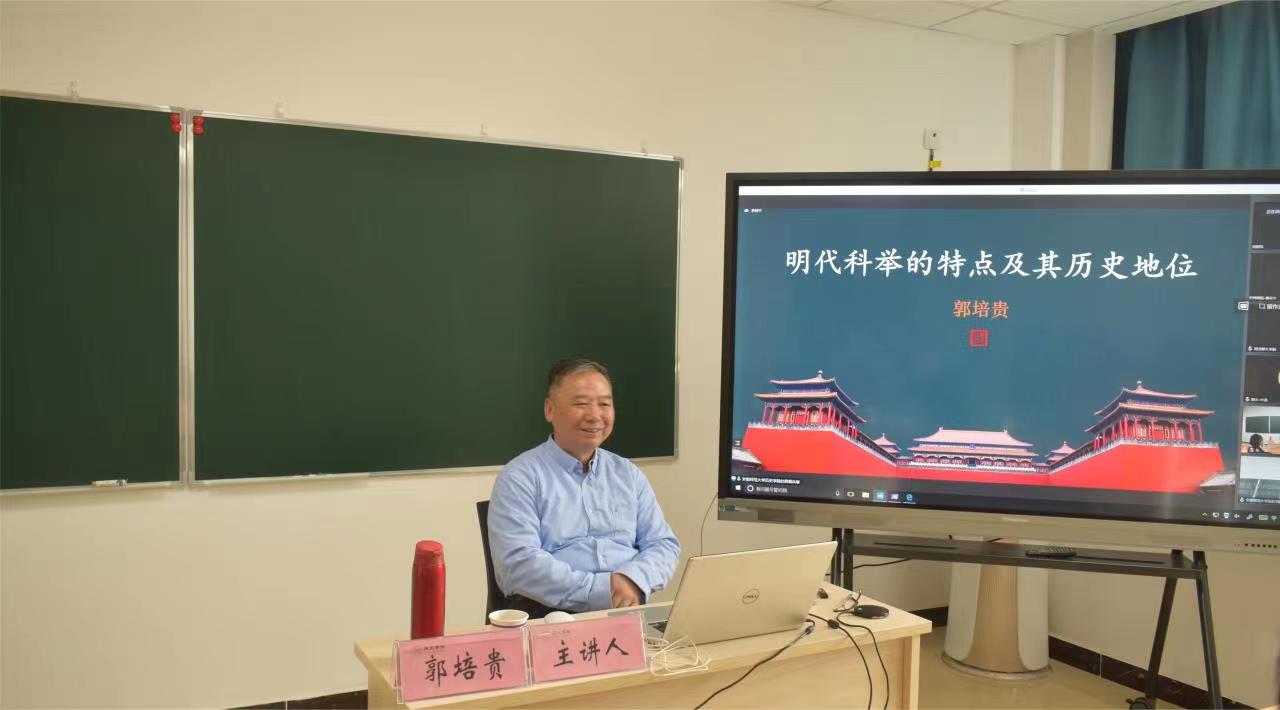 本网讯(英国上市公司365 束保成)为加快推进研究团队建设,推动中国史高峰学科发展,3月31日下午,“花津河畔话历史”第十讲暨中国史高峰学科人才制度史团队学术沙龙在文典楼B302举行,英国上市公司365特聘教授郭培贵发表题为《明代科举的特点及其历史地位》的演讲。公司副经理丁修真教授主持会议,团队成员张振国副教授、王月副教授、王翠柏博士、束保成博士、余焜博士及部分研究生代表参加了讲座。郭培贵分别从“科举与官办公司教育相结合的情况”“五级考试体系的形成”“优抚落第士子政策的发展”“边远落后地区士子的倾斜优待政策”以及“明中后期进士出身者在仕途上的优势地位”等六个方面阐述明代科举制度的特点及历史地位,论证详细,鞭辟入里,语言生动,得到了与会者的高度赞同。