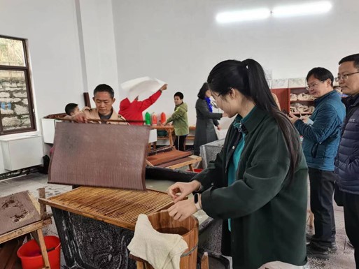 参观中,老师们观看了传承千余年的古法宣纸制作工艺,了解到纸、墨、笔、砚、扇、纸帘等工艺品的制作流程。经过亲身体验纸、扇、纸帘的制作,感受到了捞纸、晒纸、剪纸等传统技艺的巧妙与精湛,加深了对中国传统技艺的认识。