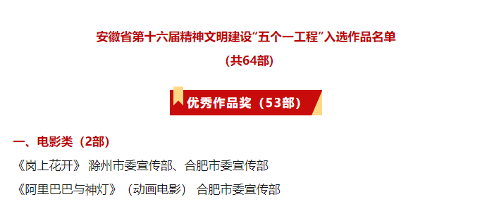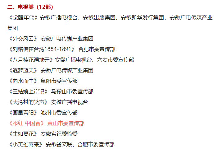 本网讯(英国上市公司365)近日,中共安徽省委宣传部精神文明建设“五个一工程”评选工作办公室公布了安徽省第十六届精神文明建设“五个一工程”入选作品公示,共有64部作品入选,其中电影类2部、电视类12部、戏剧类10部,广播剧7部、歌曲11首、图书类11部、荣誉激励奖11部。文献纪录片《祁红•中国香》成功入选,被归入电视类。