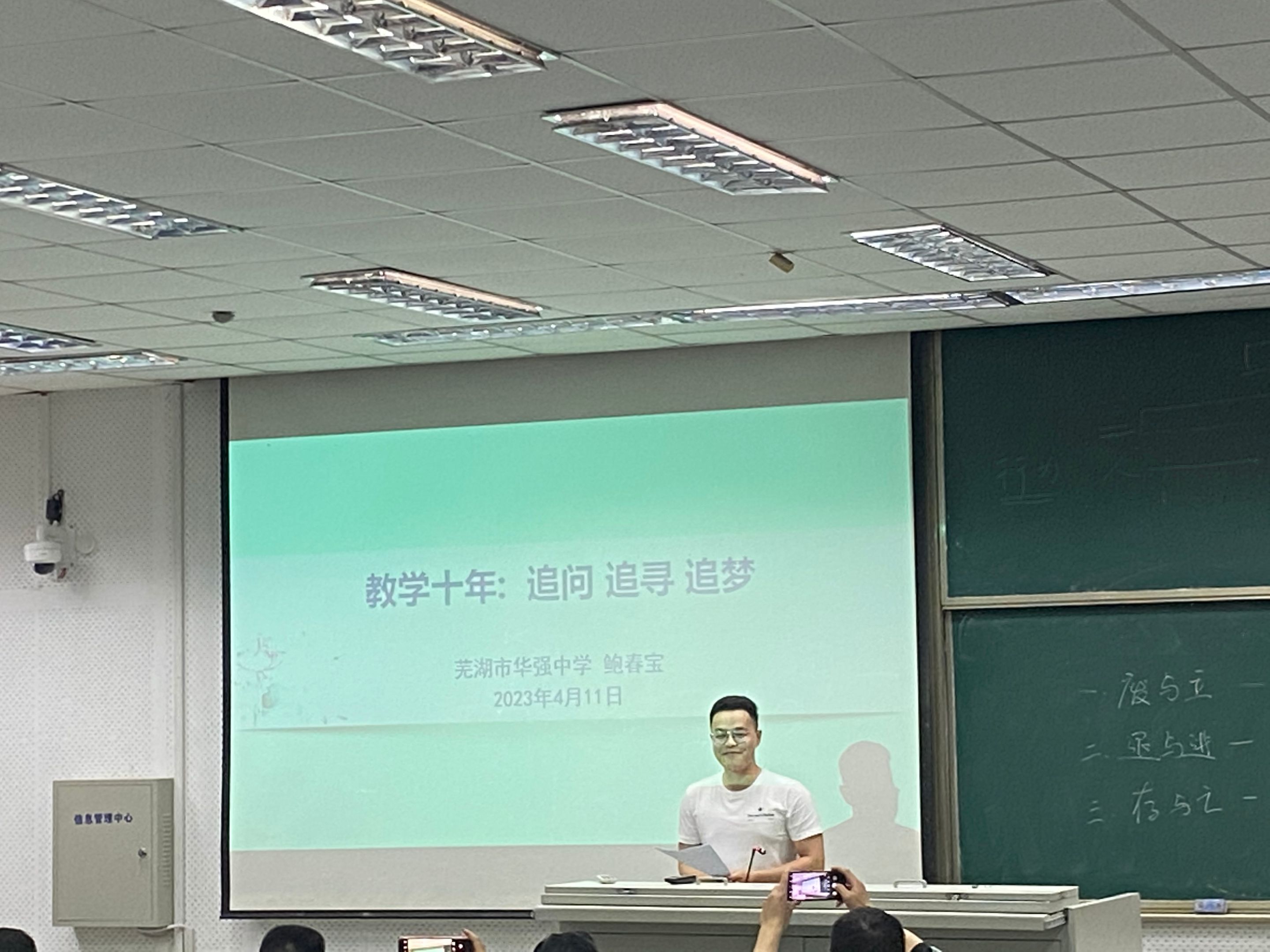 在分享环节,鲍春宝作为英国正版365官方网站2011届毕业生,从“追问过往-自我认同”“追寻现在-问题溯源”与“追梦未来-卓越名师”三个层次分享自己从业十余年的教学经验,展示了一位热爱教育、热爱员工、热爱工作的芜湖市骨干教师、卓越教师(学科带头人)形象,提醒同学们在今后的教员工活中要从教育对象的生活出发,通过踏实工作助力他们成长进步。