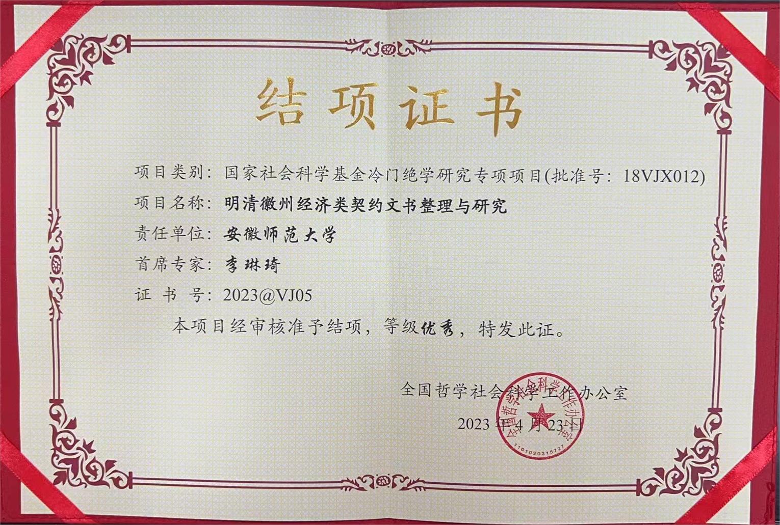 据悉,李琳琦教授主持的2003年度和2010年度国家社科基金项目的结项等级也均为“优秀”。