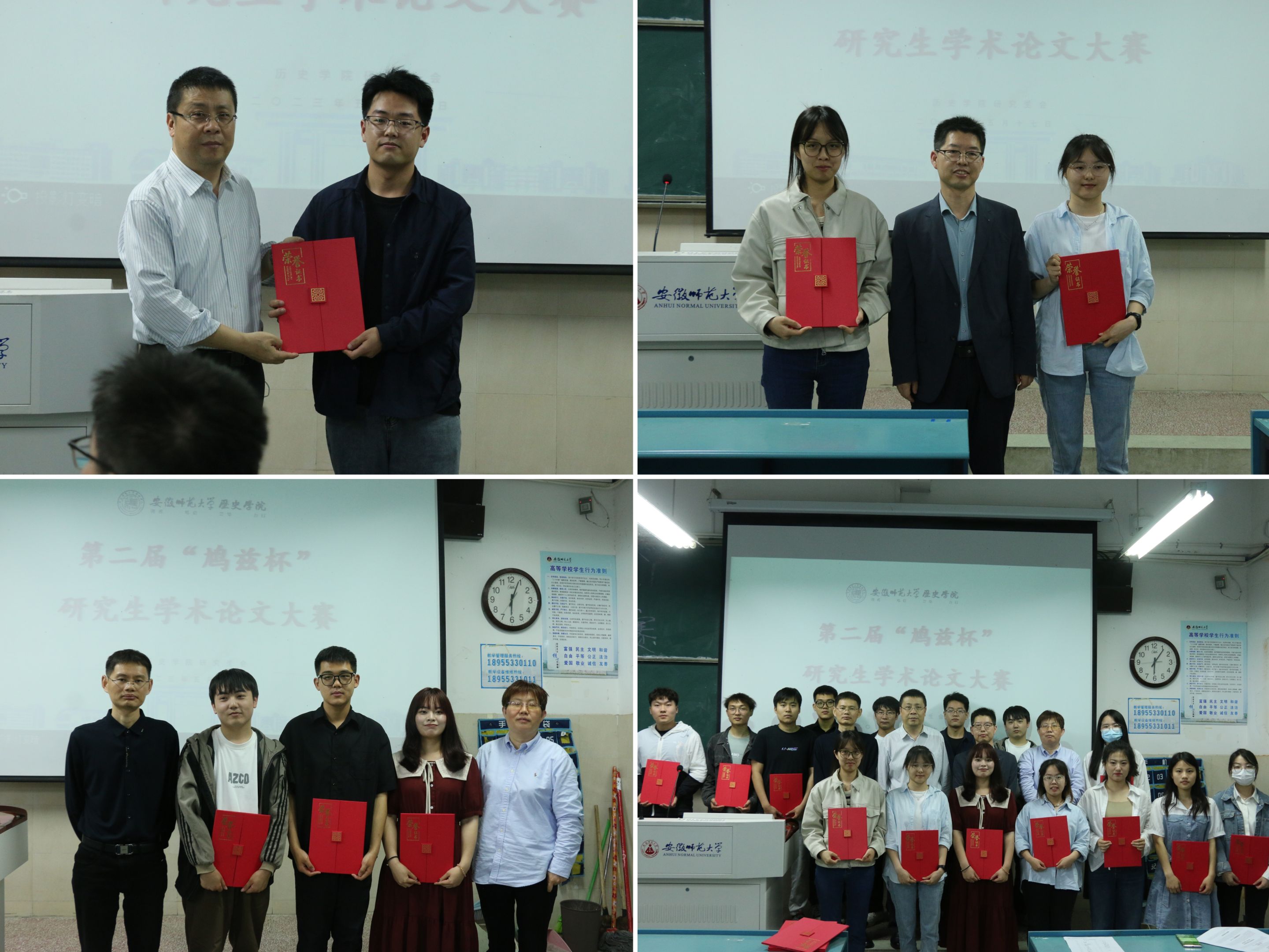 韩家炳作比赛致辞,表示研究生应当多读书,读好书,写出好文章,他提醒参赛选手要放开手脚,积极汇报,赛出风格,赛出水平。本次决赛通过抽签的方式决定论文汇报顺序,并由四位评委老师现场提问并打分。选手们从宋代科举梦演变探析、明代徽州家谱中“贤而位高者”作序现象述论、康熙七年郯城地震研究到太行革命根据地的大生产运动,从梁启超对日外交思想研究到亚历山大大帝的形象在中国的变迁。参与角逐的十七篇论文来自不同的研究方向和领域,涉及古今中外各个方面。选手们准备充分,围绕论文选题缘由、学术背景、研究思路等方面一一详细汇报,为大家呈现一场生动的学术盛宴。评委老师们结合汇报内容,就史料运用、论文结构等具体细节提出修改意见。提问环节,与会同学踊跃举手发言,比赛现场气氛热烈。经过激烈的竞争,21级近代史硕士郭少伟以“政治对峙与逐利脱序的双重困局:1922-1929年京奉铁路债务纠纷研究”一文荣获一等奖,22级学科教学赵薇、22级古代史李玉杰荣获二等奖,21级近代史的史孝武、22级世界史的华婉蓉和22级学科教学的张毅荣获三等奖。