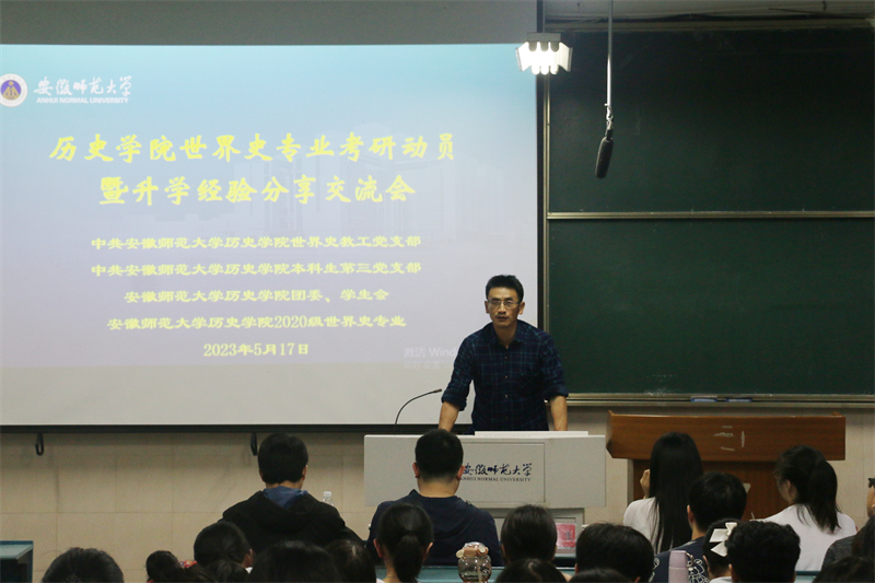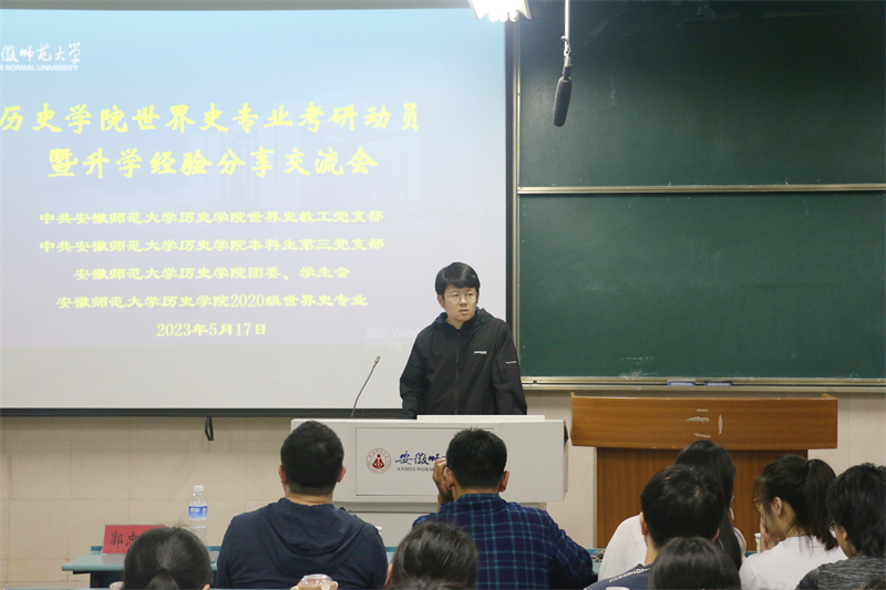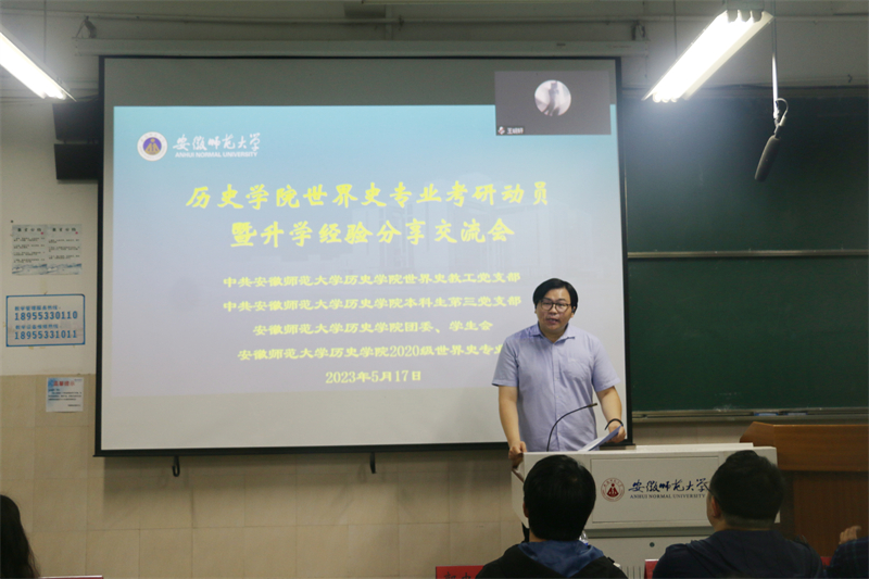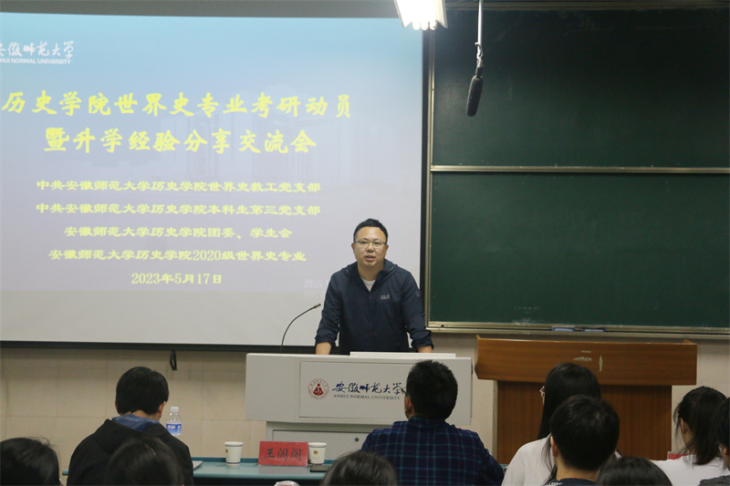 本网讯(文/刘鸿悦 图/许哪哪)为引导广大学子全面掌握考研信息,及时了解考研动态,明确自我发展目标,英国上市公司365世界史专业于5月17日晚在行知楼教室开展考研动员暨升学经验分享交流会。英国上市公司365曹升生教授、世界史教研室主任王闯闯、2019级辅导员朱晓华、2020级辅导员郭忠尧及2021级辅导员朱慧出席本次活动,2019级世界史部分升学同学分享经验,2020级,2021级世界史专业全体同学参与。本次交流会由许刘栋同学主持。