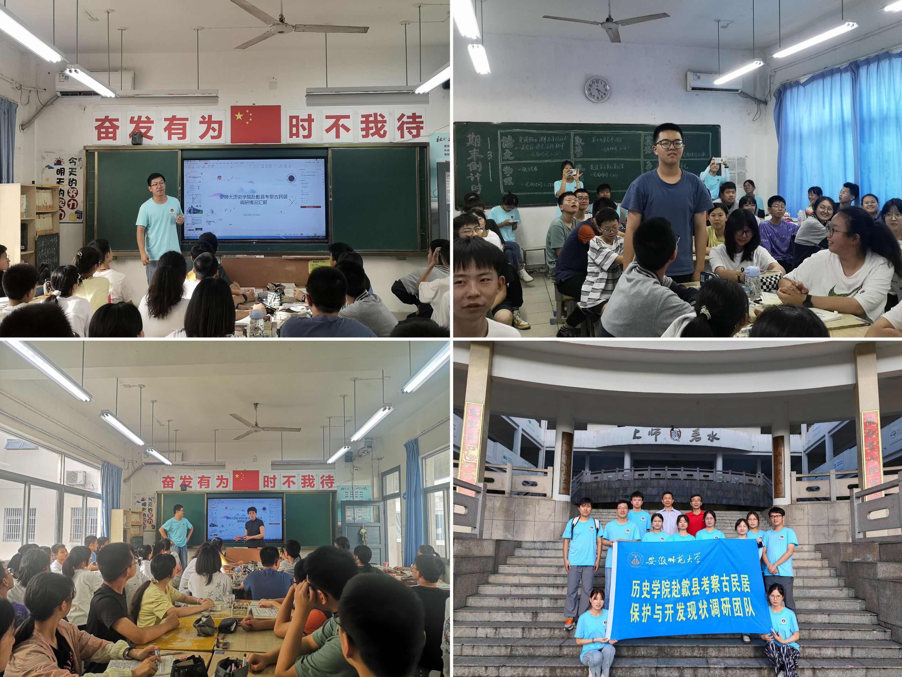 为展现调研成果,弘扬中华优秀传统文化,参与文化自信的培育工作。6月26日,团队前往黄山市屯溪区黄山公司,走进八年级(五)班教室,开展了题为“探访徽州古民居,弘扬徽州文化”的主题宣讲活动。团队充分发挥专业优势,结合近些天来有关徽州古民居保护和利用情况的调研成果,为同学们呈现了一堂具有启发性的文化宣讲课。宣讲人王恂用通俗易懂的语言进行深入浅出的分享,以ppt演示、视频展示、知识问答的形式增强课堂的趣味性,使同学们轻松参与到听讲中。他分享了团队近些天来的调研之行,着重向同学们阐释了徽州古民居的价值、徽州古民居保护面临的困境、如何保护徽州古民居等问题。