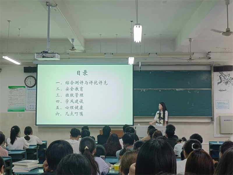 本次“开学第一课”主题班会由综合测评与评优评先、安全教育、班级管理、学风建设、心理健康、几点叮嘱六部分组成。第一部分综合测评与评优评先,老师详细介绍并解释了综合测评德育素质、智育素质,发展素质三部分的占比和内容。第二部分安全教育,排查隐患,防范诈骗,遵守校规,通过一段十分现实但又触目惊心的视频再一次向同学们安全敲响警钟。第三部分班级管理,朱晓华老师要求同学们,各司其职,执行力强,配合管理。第四部分学风建设,老师规定了课堂要求,例如专业课前十分钟会进行点名,公共课随机点名等,希望同学们养成良好的学习习惯。第五部分心理健康,老师希望同学们遇事平常心,尽力而为,积极和老师以及同学们沟通。第六部分几点叮嘱,朱晓华老师要求同学们及时反馈,严管厚爱,相互尊重,相互包容,共同进步。