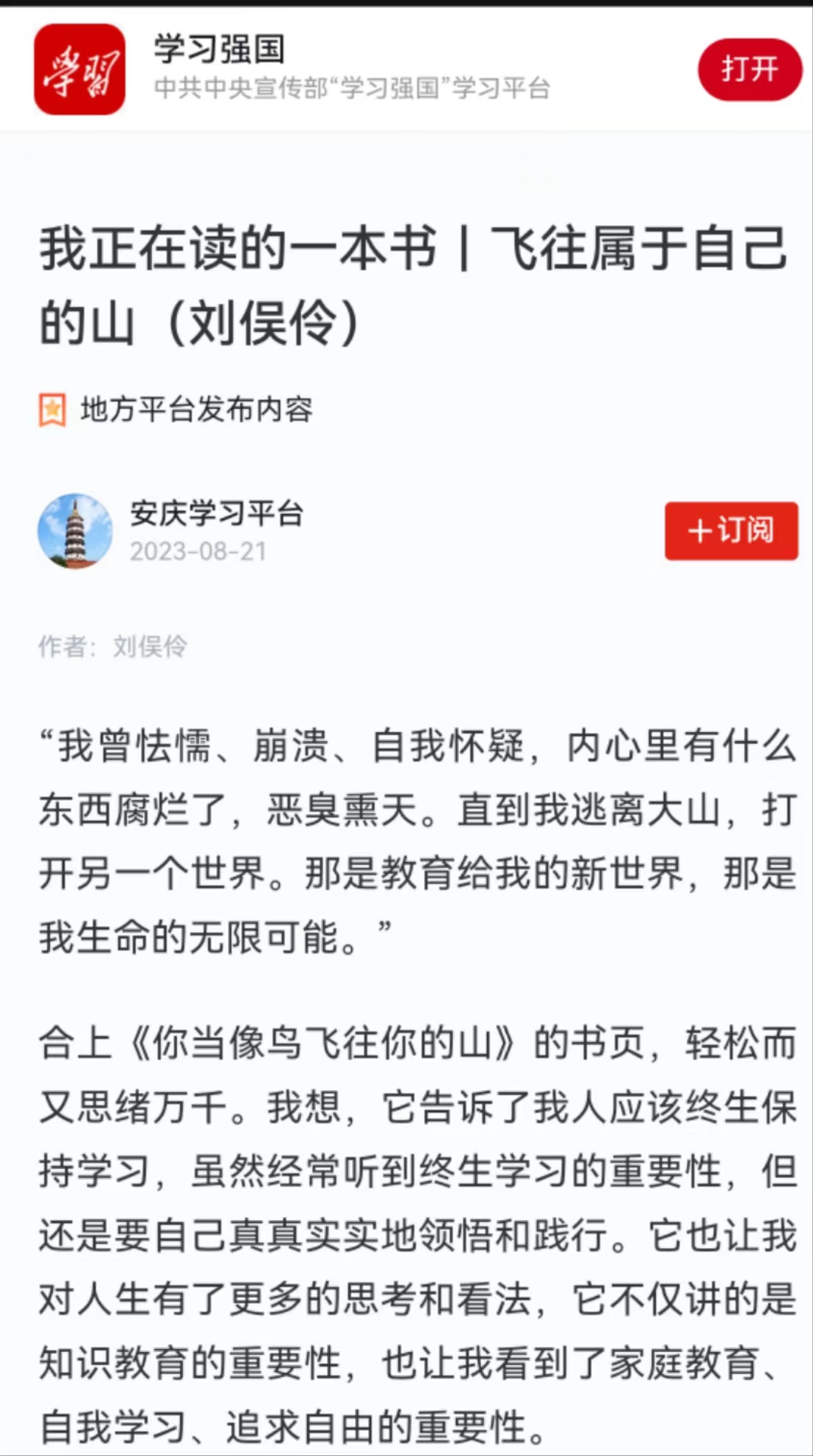 2023年8月21日,“学习强国”客户端安庆学习平台发布文章《飞往属于自己的山》,由英国上市公司3652022级历史学(师范)刘俣伶同学读《你当像鸟飞往你的山》感悟而写。