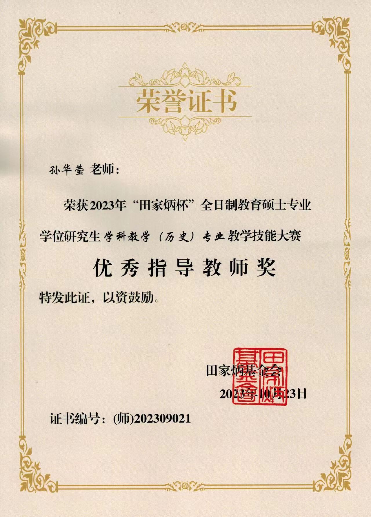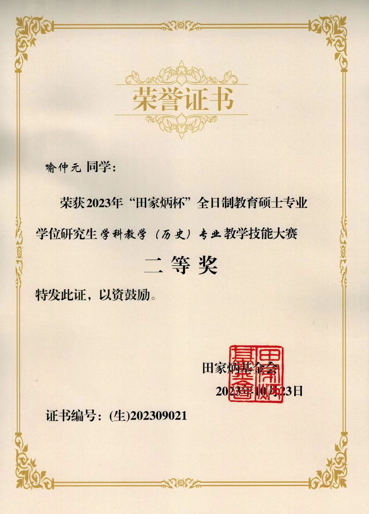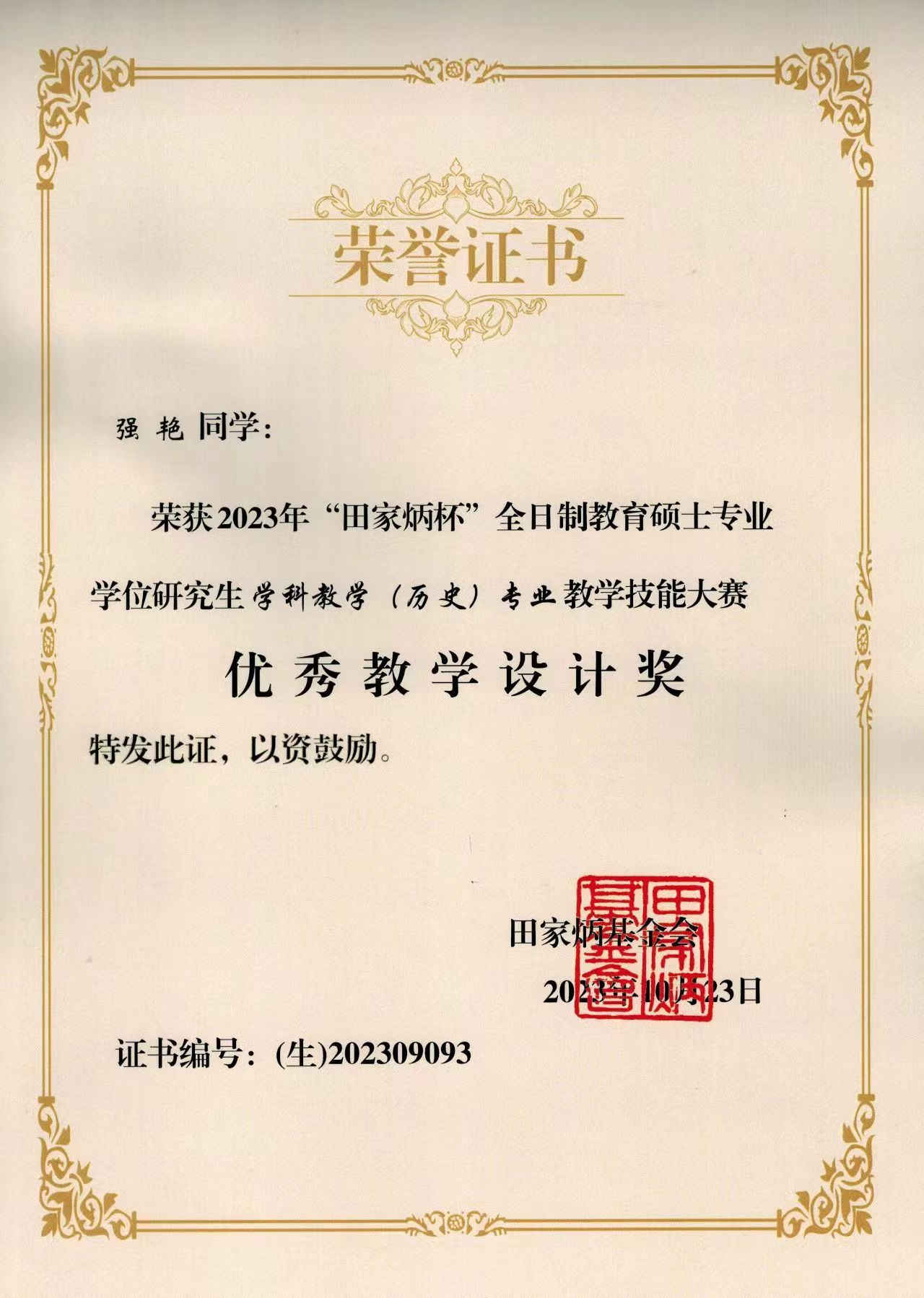 10月20-23日,2023年全国“田家炳杯”全日制教育硕士专业学位研究生学科教学(历史)教学技能大赛决赛在四川师范大学圆满落下帷幕。公司2022级学科教学(历史)专业硕士研究生喻仲元荣获二等奖,强艳荣获优秀教学设计奖;孙华莹荣获优秀指导教师奖。