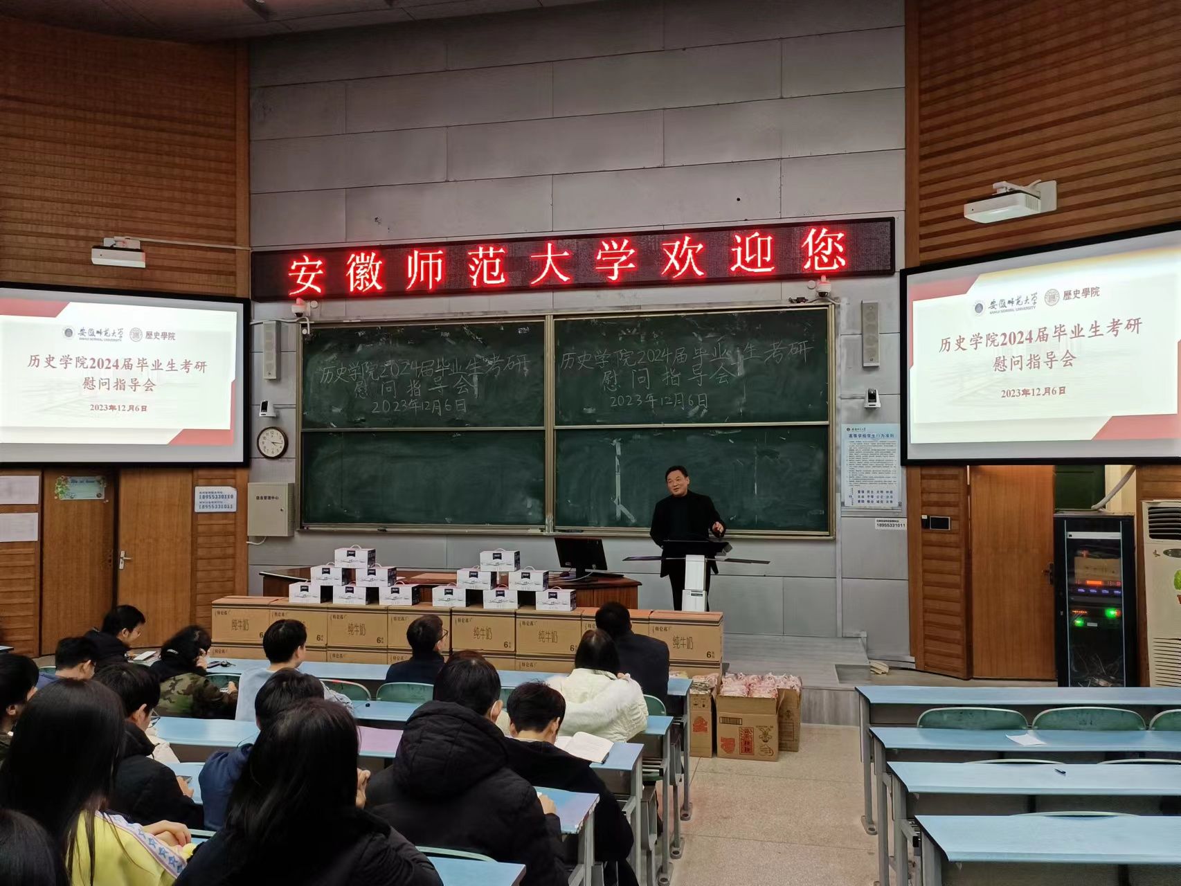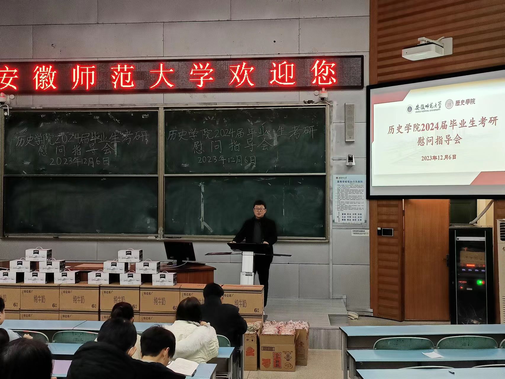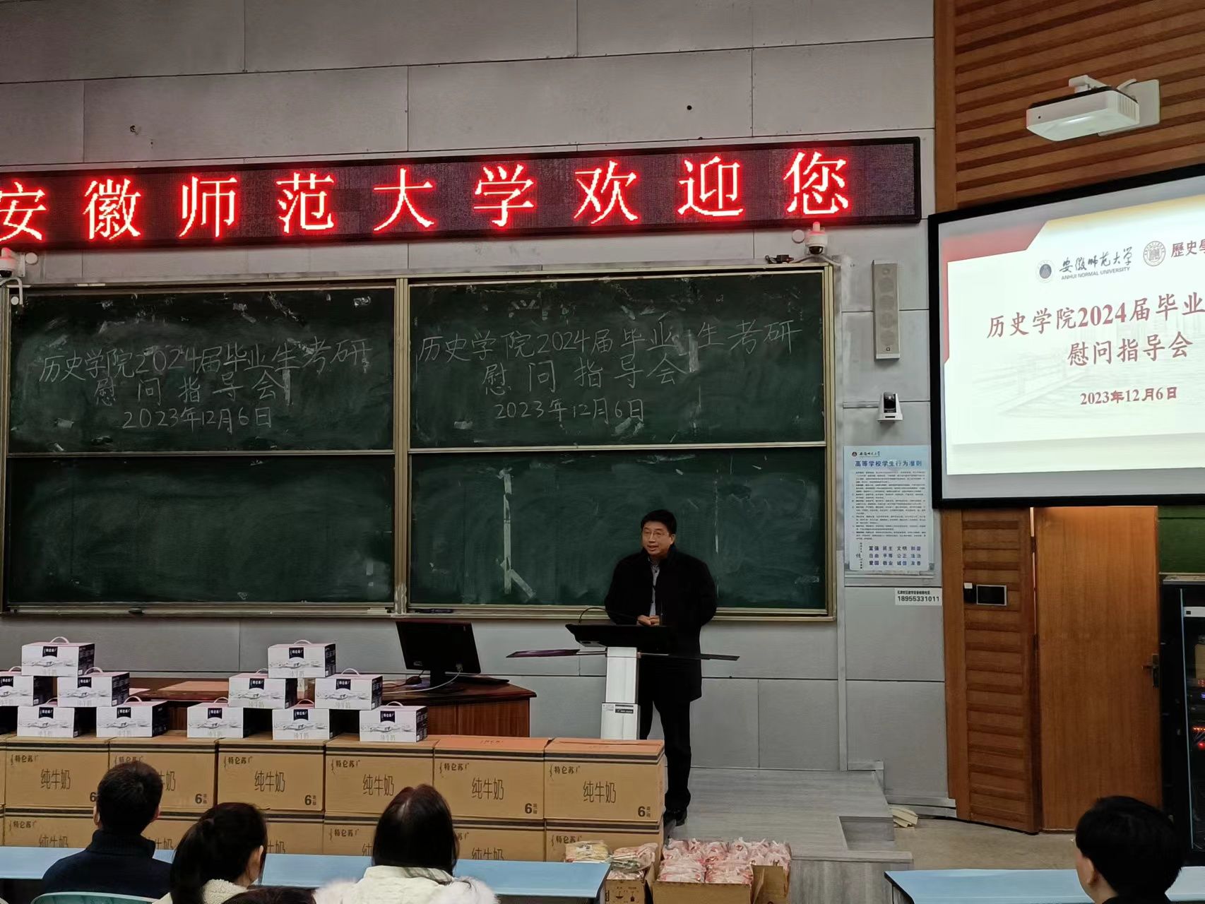 会后,领导老师们为考研员工发放了牛奶等营养食品。