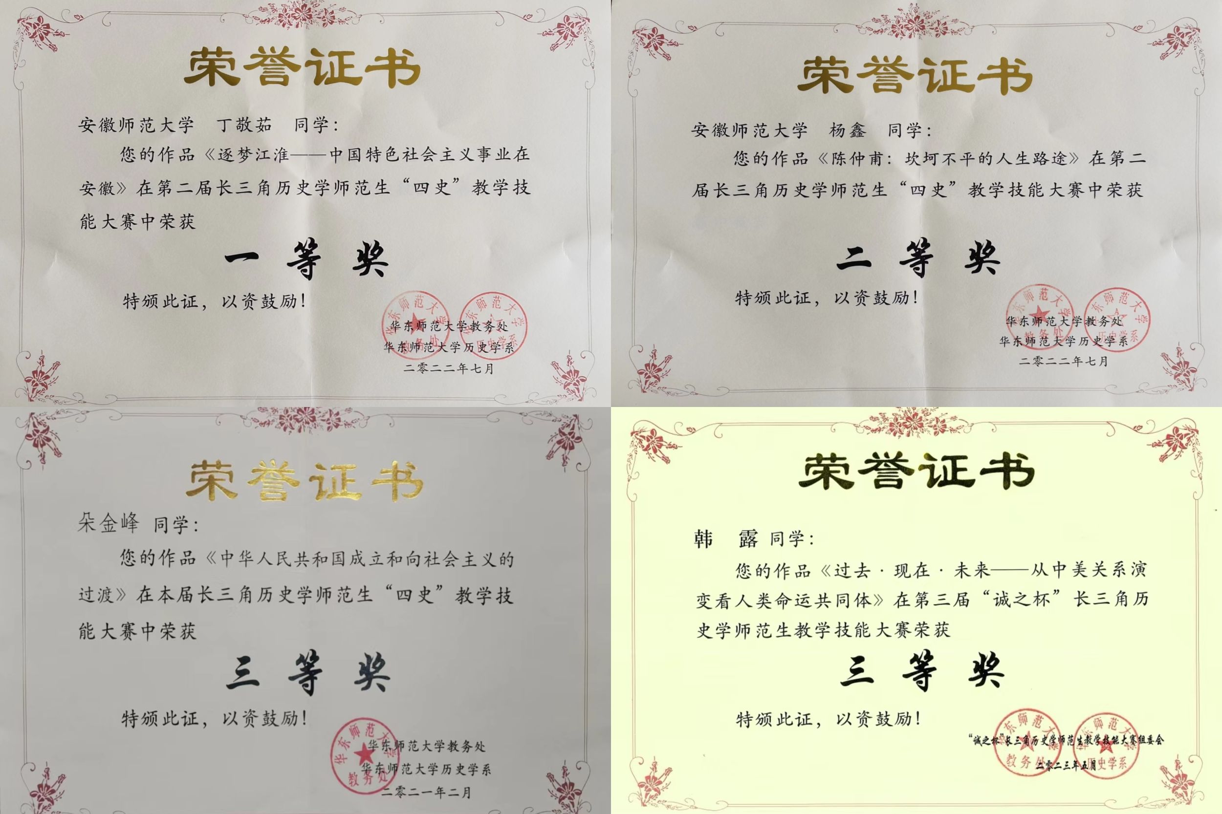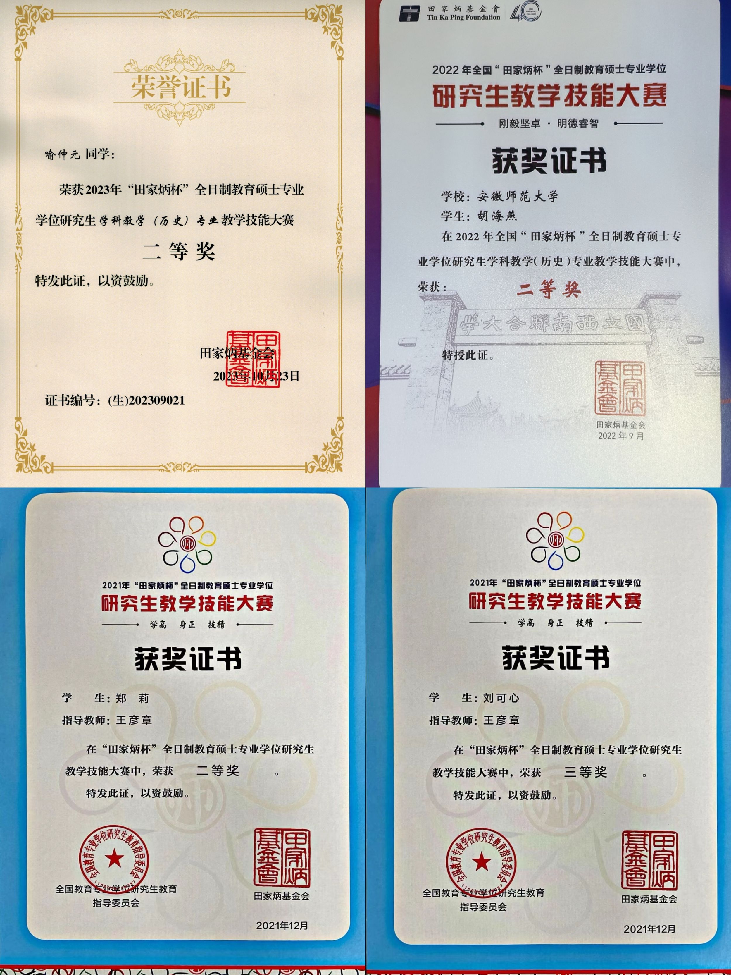 公司充分贯彻以赛促学、以赛促练的教学理念,积极组织员工参与各级各类教学技能比赛,已经形成“院级比赛—校级比赛—省级比赛—长三角级比赛—国家级比赛”五级教学技能竞赛机制,让员工在各级竞赛中逐步提升专业发展水平,确保基础教育振兴行动计划落地见效。2015年至今,教育硕士研究生参加并获得全国高校全日制教育硕士学科教学(历史)专业教学大赛、“田家炳杯”全日制教育硕士专业学位研究生教学技能大赛一等奖2项、二等奖4项、三等奖8项、优秀教学设计奖8项;参加并获得长三角历史学师范生“四史”教学技能大赛、安徽省高等师范院校历史学师范专业教学技能竞赛等省级大赛一等奖5项、二等奖7项、三等奖10项、优秀奖2项。