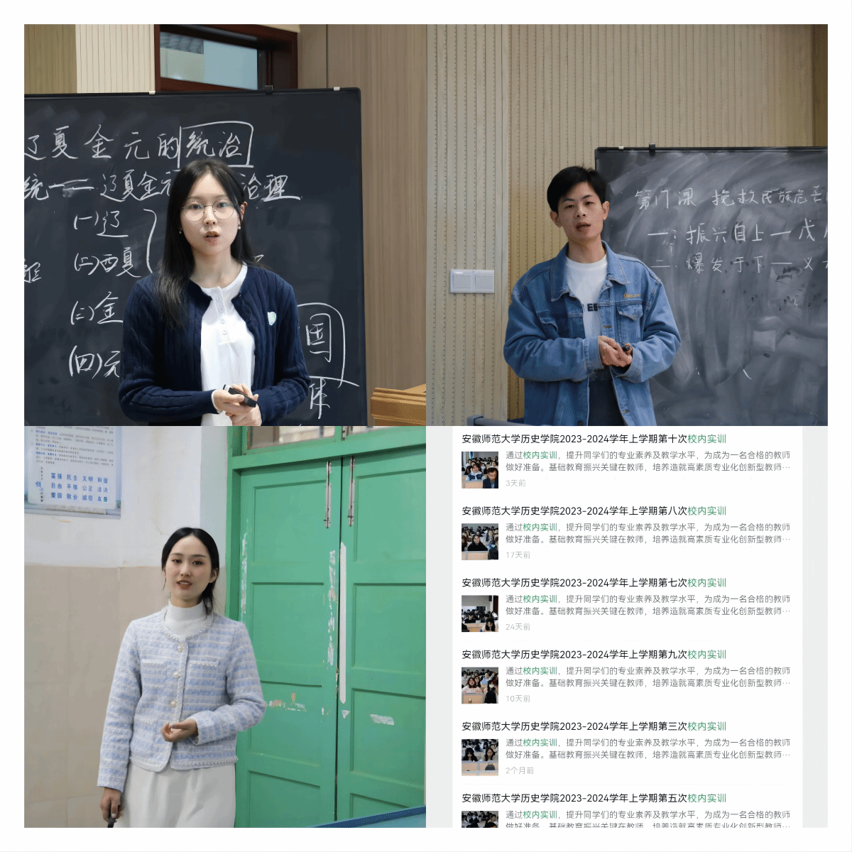 在传统课堂教学之外,公司创新公司产品实践形式,打造教育硕士和优秀师范生校内实训常态化机制。三年中,王彦章放弃周末休息时间,坚持每周六上午组织学科教学(历史)专业研究生和本科师范生进行校内实训活动。校内实训分为包含讲课、说课、史料汇报、课件汇报四个环节的展示阶段,以及员工互评与老师点评的课堂评价阶段。学位点积极邀请安徽省第四届“教坛新星”储蓉蓉等中学教学名师参与实训指导,进一步构建多元化实训工作机制。