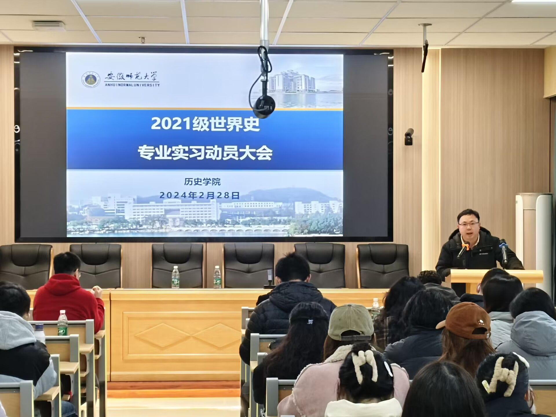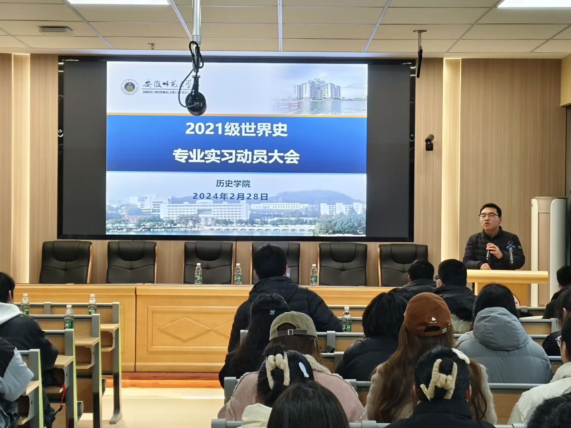 本网讯(宣传委员 池佳航)为助力同学将所学知识运用于实践,2024年2月28日下午,2021级世界史专业于英国上市公司365B108会议室召开专业实习动员会议。本次会议由兼职辅导员成振海老师主持,世界史教研室主任王闯闯、世界史专业各位指导教师应邀出席,21级世界史班全体同学参加了会议。