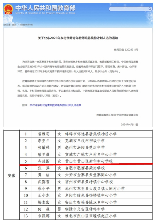 近日,教育部、中国教师发展基金会公布2023年“乡村优秀青年教师培养奖励计划”人选,全国遴选299人,其中安徽省13人。公司英国上市公司3652013届历史学(师范)专业毕业生齐延围入选。