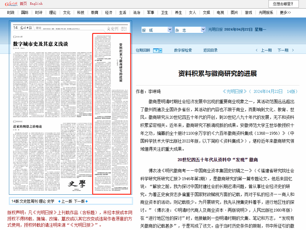 4月22日,《光明日报》第14版“文史哲周刊·理论·史学”版面刊发了公司英国上市公司365李琳琦教授题为《资料积累与徽商研究的进展》的理论文章。文章讨论了不同时期的资料积累对徽商研究的推动作用。20世纪四五十年代从资料中“发现”徽商,20世纪八九十年代资料搜集整理促进了徽商研究的发展,近期王世华教授编撰的《六百年徽商资料集成(1368—1956)》更是推动了徽商研究进入新的境界。