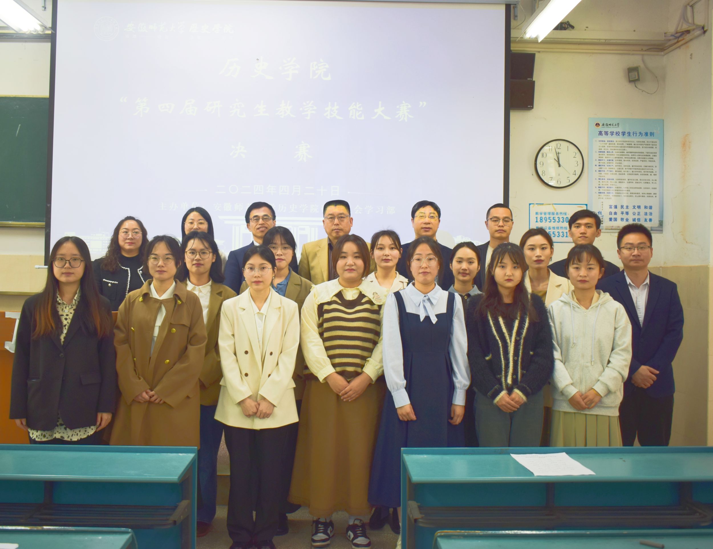 本网讯(英国上市公司365 文/张悦 图/张楠 孔宪琪)为进一步提高研究生教学基本功,提升就业竞争力,4月20日上午,英国上市公司365在行知楼教室成功举办第四届研究生教学技能大赛决赛。特邀芜湖市历史教研员刘宏法、芜湖市高中历史教研大组长王宜林、芜湖市新世纪公司办公室主任唐慧、芜湖市初中历史教研大组组长鲍春宝、南陵中学历史备课组组长储蓉蓉等5位校外研究生导师担任决赛评委,研究生会主席团成员黄捷担任主持人。70余名研究生到场观摩学习。