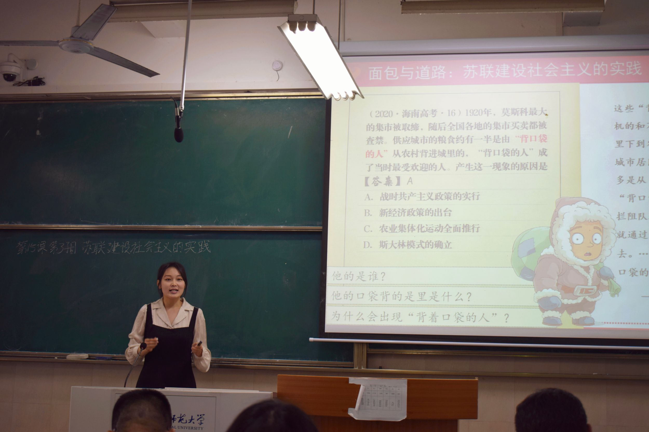 接着,评委们对每位选手进行针对性的点评和提问。储蓉蓉围绕“如何讲好历史背景”这个问题进行点评,她指出需将历史背景放在较长的时间段中进行讲解,体现时空观念的核心素养,并且讲授过程既要展现外在的条理性,也要体现内部的逻辑性;唐慧主要强调了在教学设计中要目标先行,讲解过程中要精炼语言;鲍春宝结合选手的表现指出情境创设要有始有终,材料使用需谨慎,培育好家国情怀;王宜林首先提出问题“材料的选取能不能满足教学问题的需要?”,他指出材料的使用要精准,最后他强调板书的设计需体现逻辑;刘宏法老师从教学框架合理性,文字表达准确性,板书设计规范性,主题完整性四个方面对选手们进行点评,让人获益匪浅。