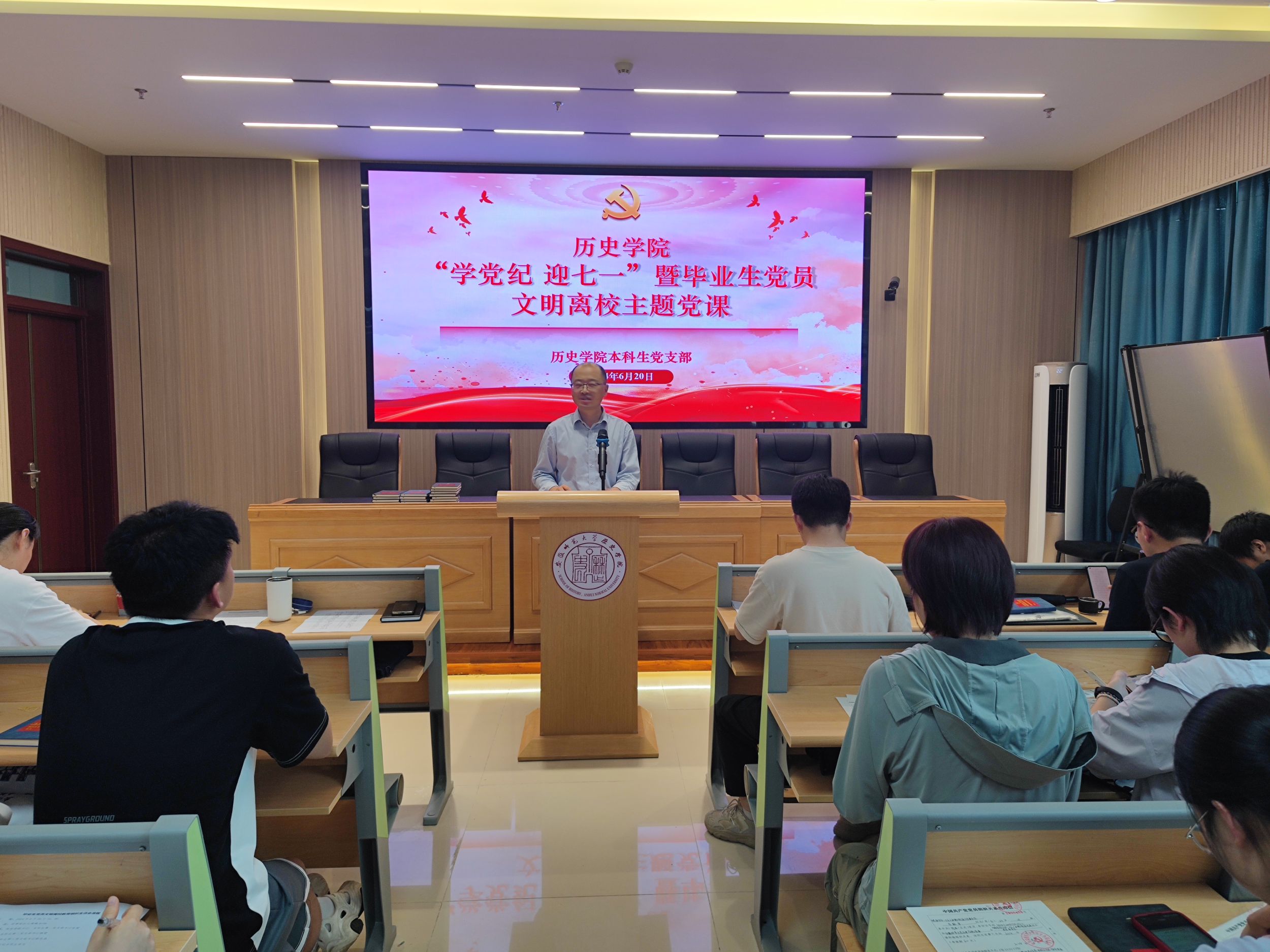 宫超在仪式结束后开展了“学党纪,迎七一”暨毕业生党员文明离校主题党课。他回顾了2024届毕业生党员在校期间的成长与收获,提出“严守党纪党规,永葆初心本色”“秉持家国情怀,闯出人生高度”“砥砺接续奋斗,勇于干事创业”三点要求,嘱托毕业生党员牢记党纪党规和党员身份,努力践行全心全意为人民服务的宗旨,在毕业季期间“树形象、勇担当、做表率”,既成为文明离校的表率,也成为朋辈育人的先锋。