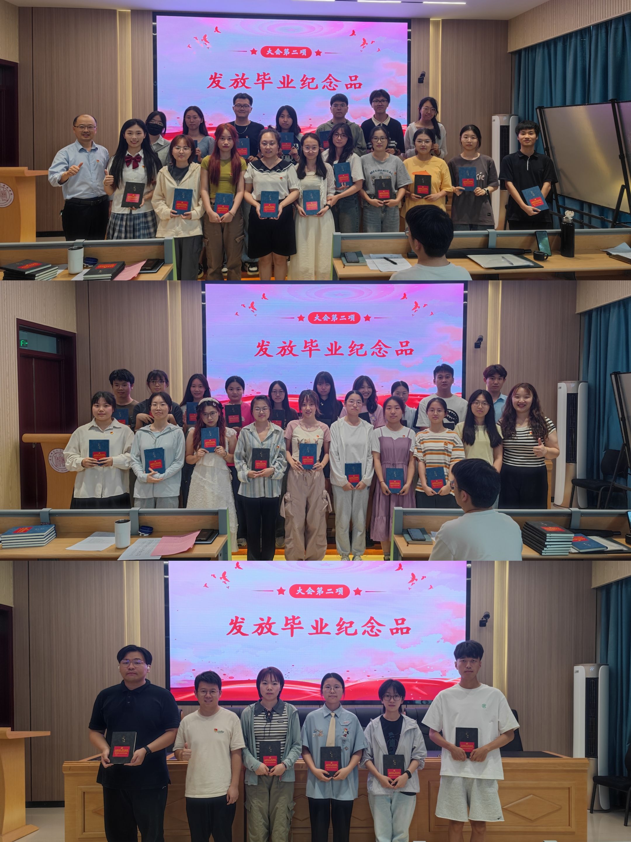 会上,毕业生党员代表纷纷上台发言,他们感谢党组织的培养及领导老师的亲切教导,使他们在入党过程中不断提升个人综合素质,在校期间始终冲锋在服务公司、服务班级、服务师生的第一线,真正做到以实际行动服务群众作贡献。发言完毕后,支部书记们为毕业生党员发放毕业纪念品并合影留念,祝他们前程似锦。