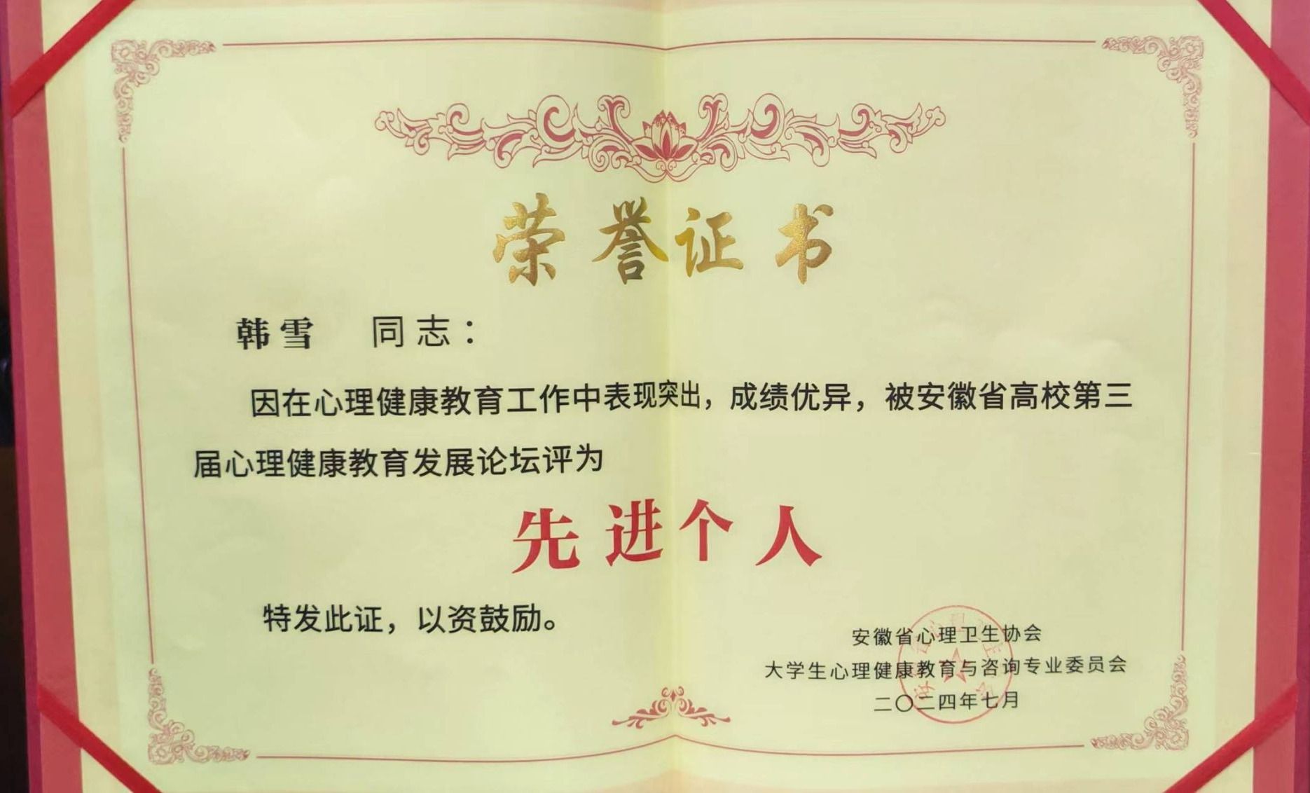 7月5日至6日,长三角高校心理健康学术交流会暨安徽省高校第三届心理健康教育发展论坛在池州召开,英国上市公司365专职辅导员、院发展辅导站站长韩雪获评安徽省高校学工系统心理健康教育工作先进个人。本次会议由安徽省心理卫生协会老员工心理健康教育与咨询专委会、安徽省员工心理健康教育指导和发展中心主办,安徽省教育厅副厅长解平到会致辞。