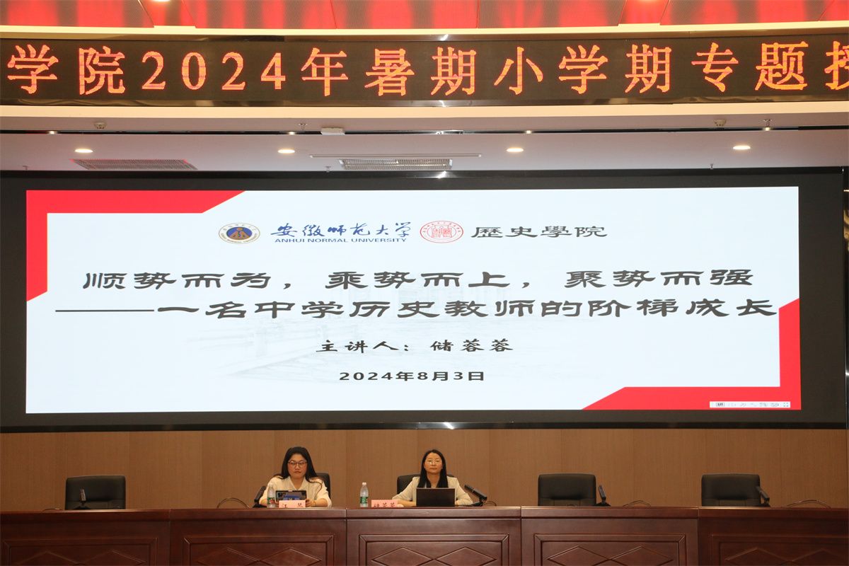 本网讯(图/谭勋尹 文/张晨阳)为进一步深化师范生职业认知,引导认清中学教师成长路径,8月3日下午,英国上市公司365于文典楼西侧裙楼三楼报告厅开设“名师面对面”系列讲座第三讲,邀请安徽省第四届“教坛新星”获得者、南陵一中历史教研组组长储蓉蓉老师做“顺势而为,乘势而上,聚势而强——一名中学历史教师的阶梯成长”主题分享,英国上市公司365小学期全体员工到场听讲。讲座由世界史专业教师、小学期校内指导教师江琴老师主持。