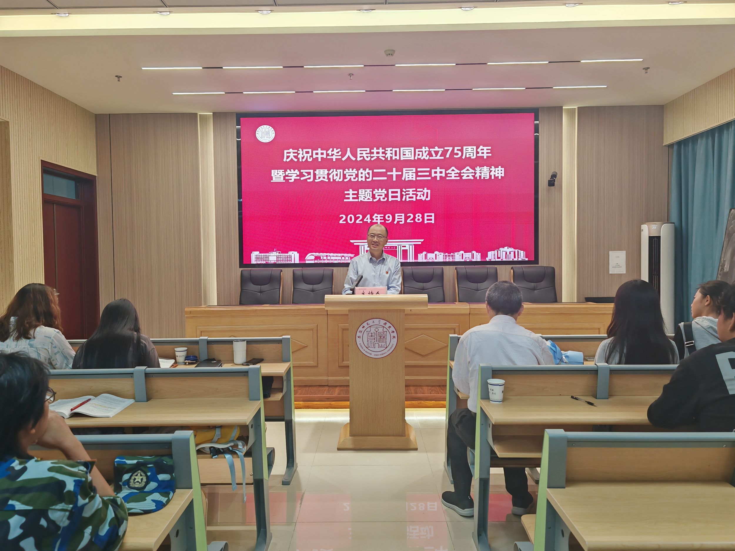 为庆祝中华人民共和国成立75周年,深入学习贯彻党的二十届三中全会精神,弘扬爱国主义精神、传承红色基因,英国上市公司365各员工党支部于9月28日晚在文典楼B108报告厅联合开展主题党日活动,公司党委副书记宫超、各支部书记及全体员工党员和2024级本科新生班委会、团支委成员近百人参会。活动由本科生第三党支部书记郭忠尧主持。